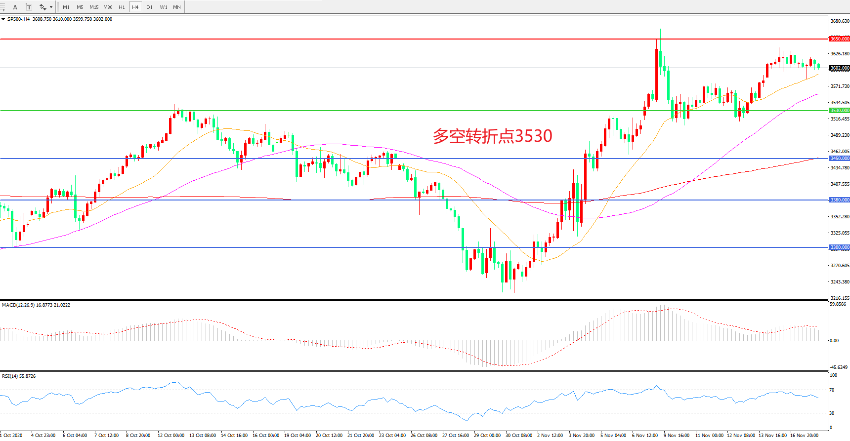 4小时图看,标普500震荡上行,整体表现相对强势,3650成为短期阻力,21周期均线成为下方支撑,MACD红柱增加,RSI指标向上,日内延续上行概率较大。
