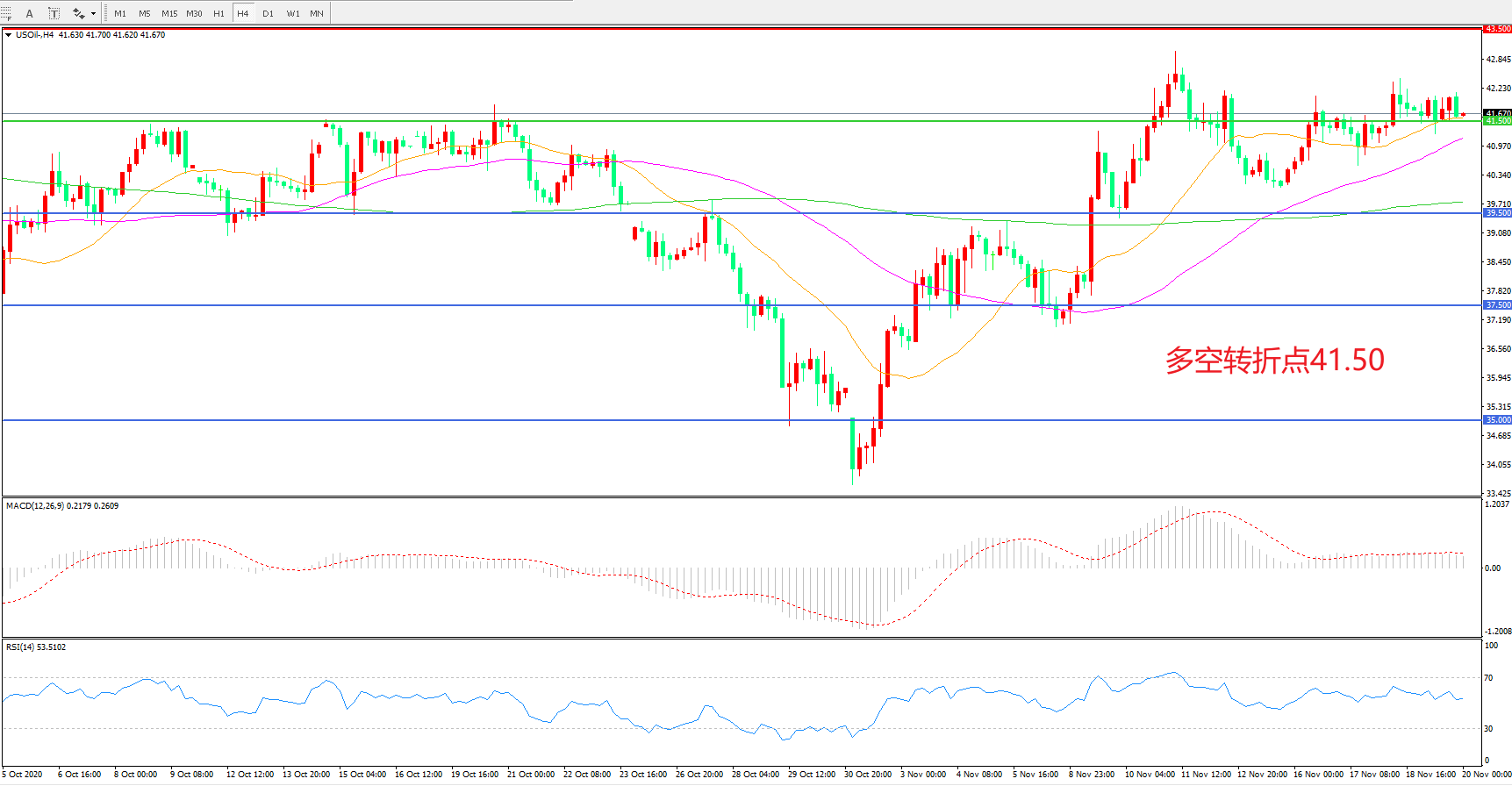 4小时图看,油价延续高位震荡,低点逐渐抬高,短期表现有所回暖,41.5成为多空分水岭,21周期均线成为短期支撑,MACD红柱增加,RSI指标走平,日内震荡上行概率较大。