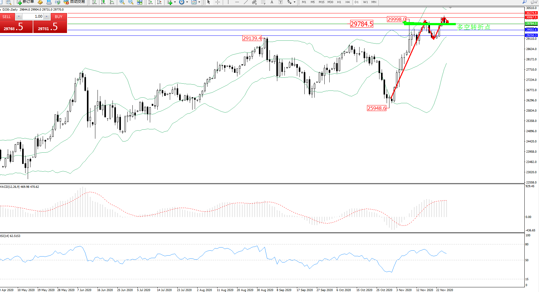 道琼斯指数11月25日(周三)收盘下跌173.80点,跌幅0.58%,报29872.47点。道琼斯工业平均指数回落至3万点下方;受美国感恩节假期影响,美国股市将休市一日,今日(周五)22:30正常开盘,但收盘时间将提前至周六02:00。新冠疫苗积极进展所推动的从科技股到周期股的轮动出现逆转,因最新经济数据显示复苏可能正在放缓。市场预期美国利率在未来数年将维持在纪录低位附近,同时有关新冠疫苗的各种消息帮助提振投资者对风险较高货币的胃纳。美联储决策者在11月政策制定会议上讨论了如何调整其资产购买计划,以为市场和经济提供更多支持。市场预计美元将继续下跌,因为疫苗方面的进展,以及前美联储主席叶伦将担任下一任美国财政部长的预期,缓解了投资者的两大不确定性。