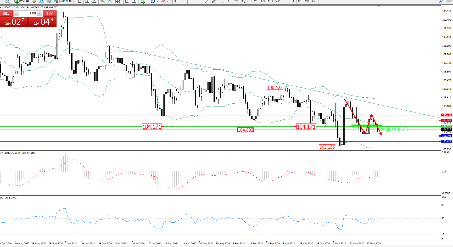 美元兑日元跌0.16%至104.09,一度跌0.3%至103.91,疫情凶猛、阿斯利康疫苗遇挫支撑避险资产需求,日元创四日新高;球新冠病例仍在蹿升支撑了市场对最安全资产的需求。 美国股市期货承压,美国国债小幅上涨,阿斯利康发布声明称,由于当前研究引发质疑,可能会在全球进行新一轮新冠疫苗试验。谨慎情绪当道,纽约新增感染病例达七个月新高,美国即将发布大量重要经济数据,可能显示经济放缓。11月ISM制造业和非制造业数据预计都将比前一个月略有下降。非农就业数据预计也显示就业增长放缓,预计年底美元兑日元在103-108之间波动。