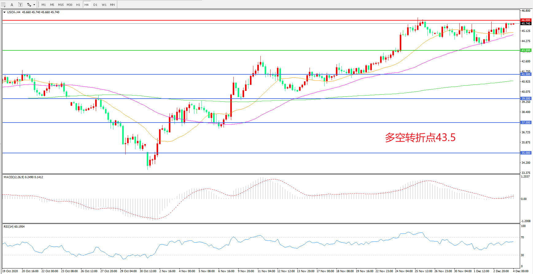 4小时图看,油价延续高位震荡,整体表现相对强势,55周期均线成为短期支撑,46美元成为中期阻力,MACD红柱减少,RSI指标走平,日内延续震荡概率较大。