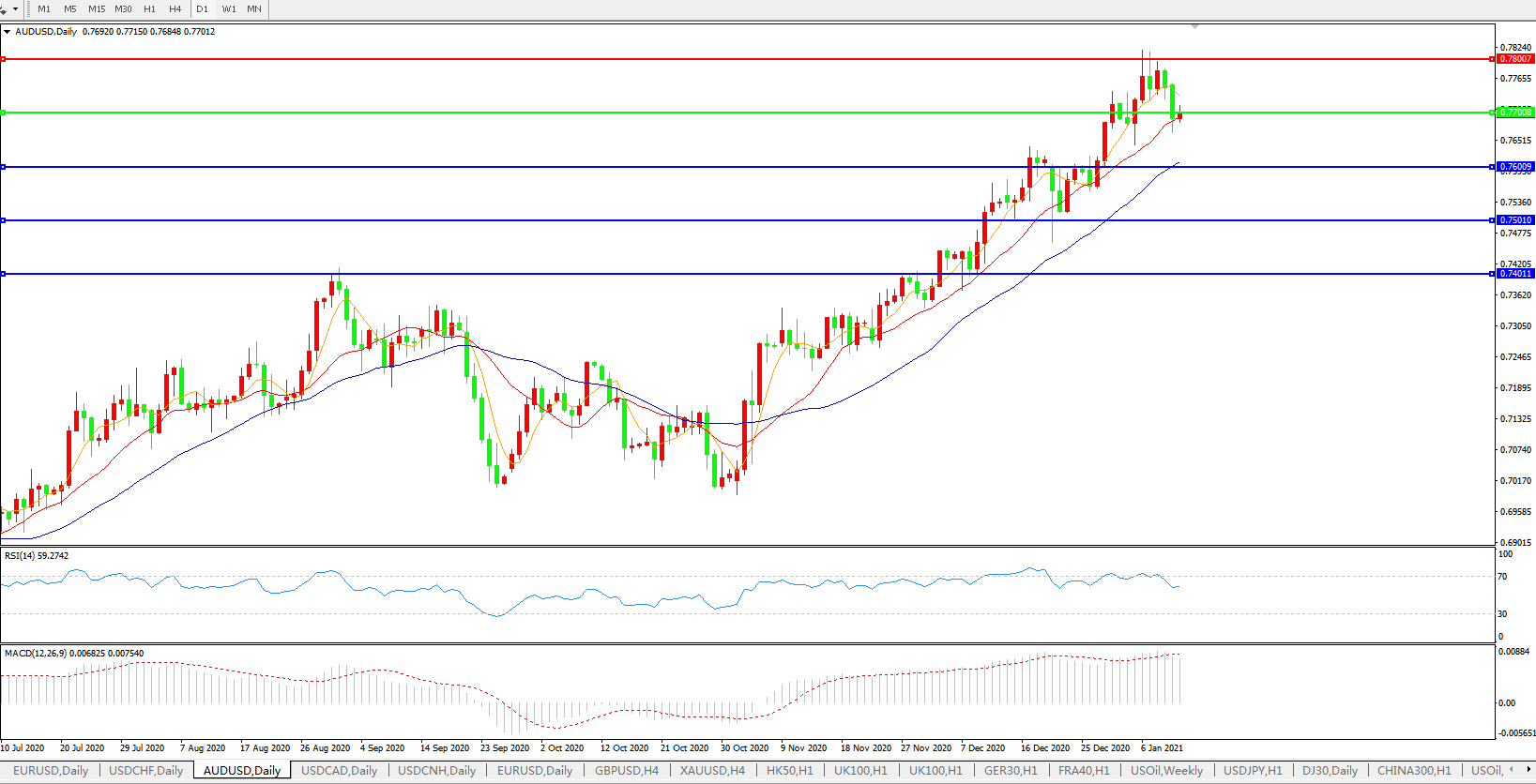 交易策略:0.7700下方看跌,目标0.7600、0.7500