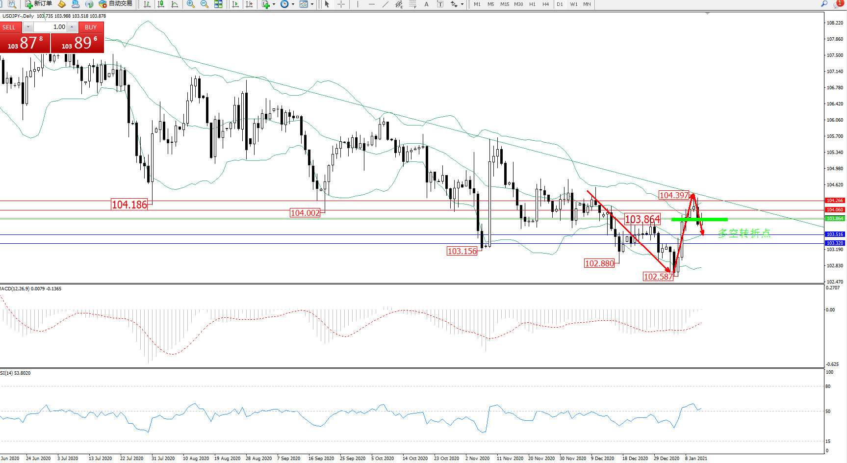 技术点评:空头动力延续布林带指标通道内持续震荡下行至102.587位置后得到支撑开始强势反转拉升上扬,高位抵达104.397位置遇阻回撤,空头动力伺机再度入场下行,处于布林带指标通道中上轨区间持续震荡中,关注中上轨区间关键节点,布林带指标呈缓慢张口走势中,MACD指标处于空头区域弱势震荡上移至0轴线附近徘徊,RSI指标低位多头动力上攻至50均衡线上方持续震荡整理中;