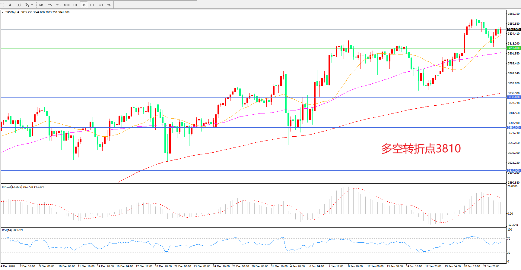 4小时图看,标普500长阳拉升后小幅回落,上行趋势暂缓,3810成为下方支撑,短期均线拐头向上,MACD红柱增加,RSI指标走平,日内延续震荡概率较大。