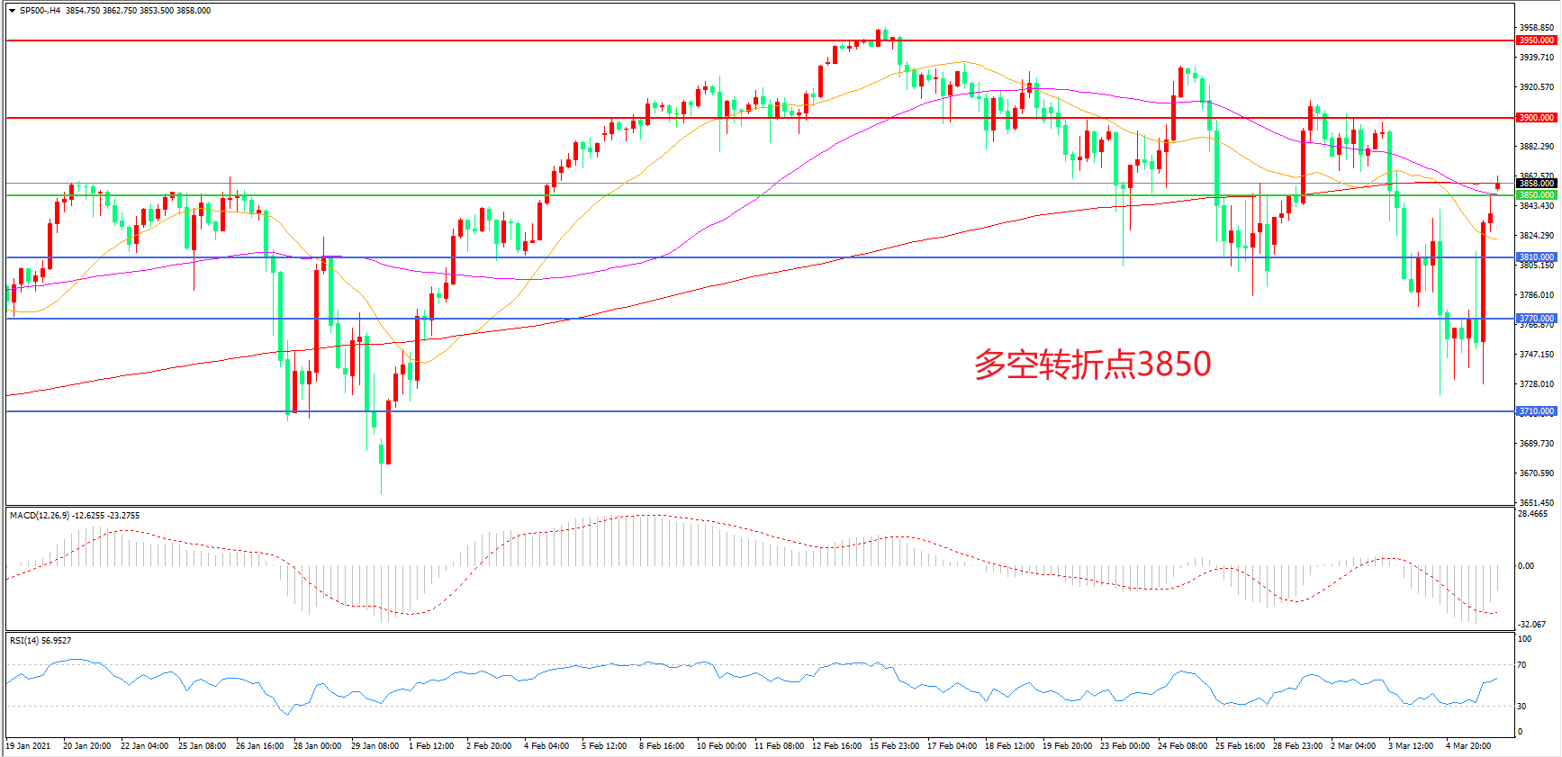 4小时图看,标普500长阳拉升,短期走势有所回暖,但均线系统形成上方阻力依然存在,MACD绿柱缩短,RSI指标走平,日内延续震荡概率较大。