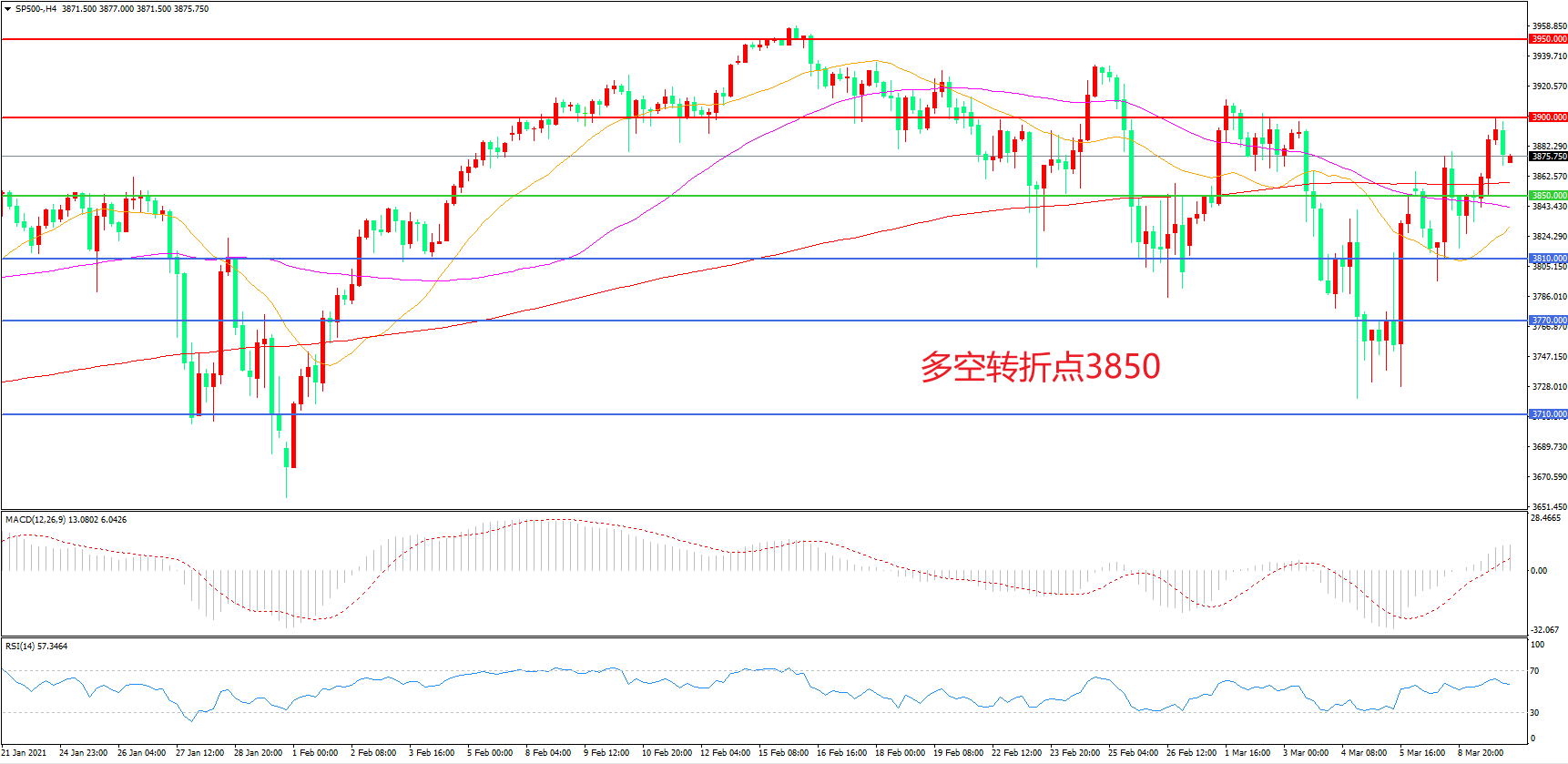 4小时图看,标普500长阳拉升,触碰3900后小幅回落,短期走势陷入震荡,均线系统走平形成下方支撑,3900成为上方阻力, MACD红柱增加,RSI指标走平,日内延续震荡概率较大。