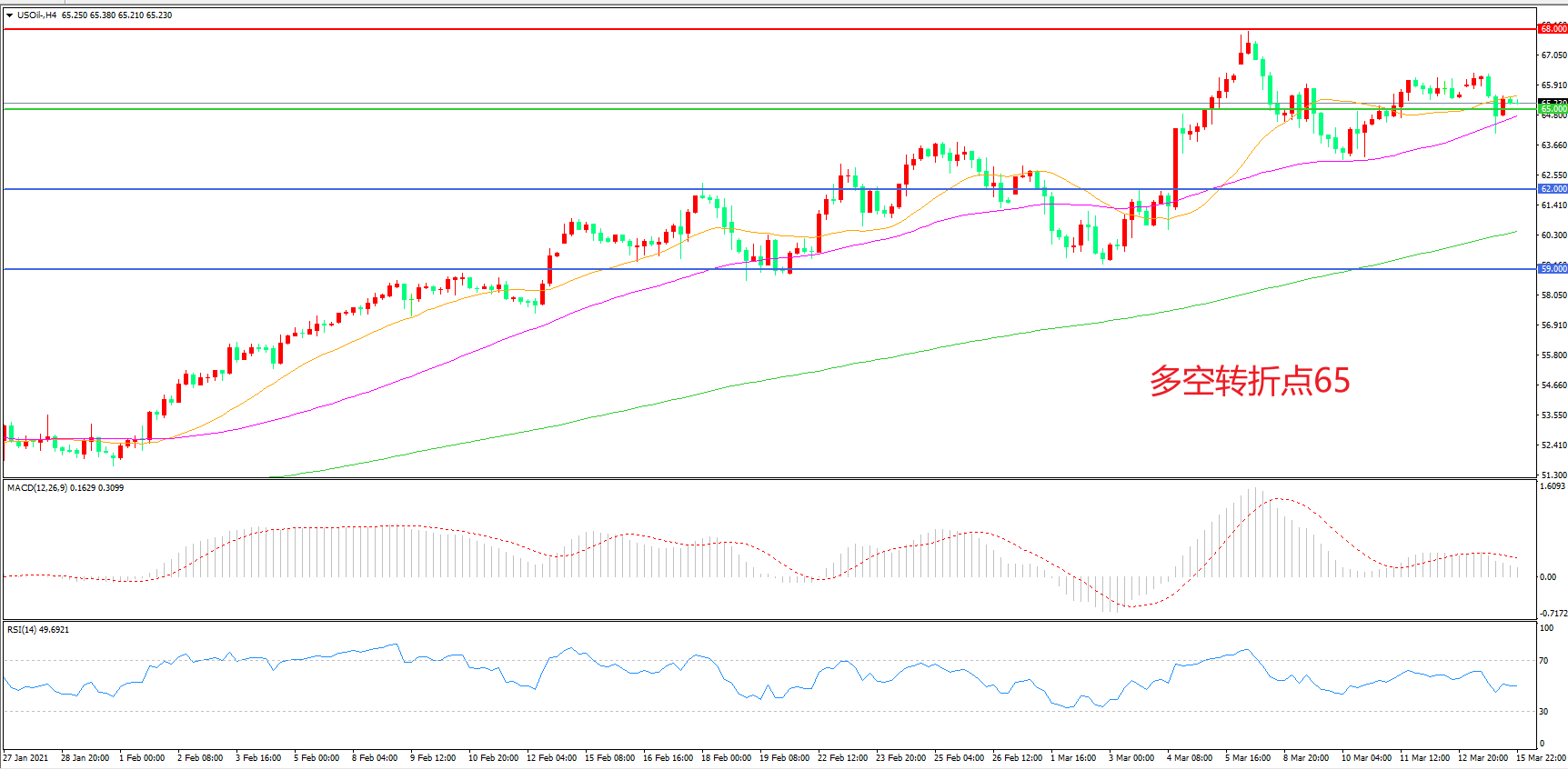 周一(3月15日),尽管周一中国经济数据乐观,但市场传闻拜登政府正在研究加税方案,打压了市场中的风险情绪,美国WTI原油延续高位震荡,收报65.00美元/桶。前两周美国市场呈现了原油库存大增,成品油库存大降的格局,但整体全口径库存维持相对平衡。随着美国原油产量的超额恢复,本周很有可能会继续出现美国原油库存大增,成品油库存下降的趋势,市场逻辑就可能会演变为油价在库存的打压之下出现下行趋势。