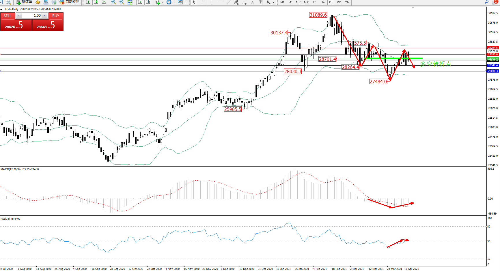 技术点评:空头动力延续布林带指标通道中下轨区间持续震荡下行,低位抵达27484位置后开始反转上移,持续震荡上移至中上轨区间整理,空头动力有伺机再度入场迹象,布林带指标呈收口走势后开始持续平移中,关注中轨附近节点,MACD指标处于0轴线下方空头区域维持整理平移,RSI指标处于50均衡线附近弱势徘徊中;