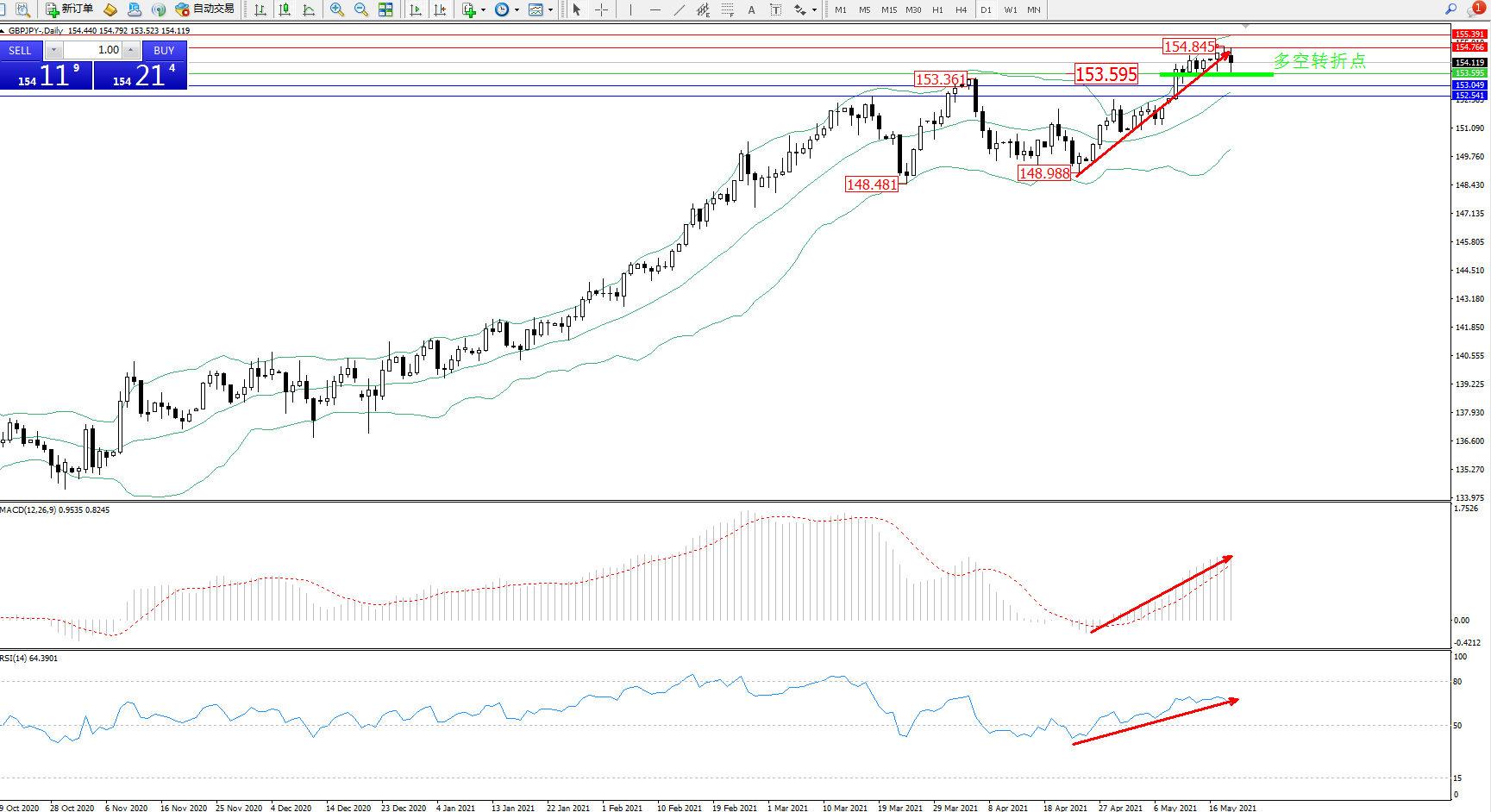交易策略:153.595上方看涨,目标154.766、155.391