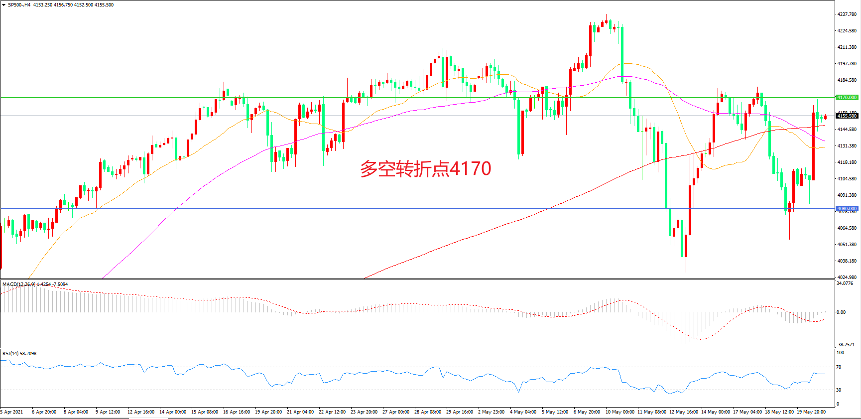 4小时图看,标普500回踩4080后大幅拉升,短期有所回暖,但形态上表现区间震荡迹象依然明显,均线系统走平,MACD绿柱减少,RSI指标走平,日内延续震荡概率较大。