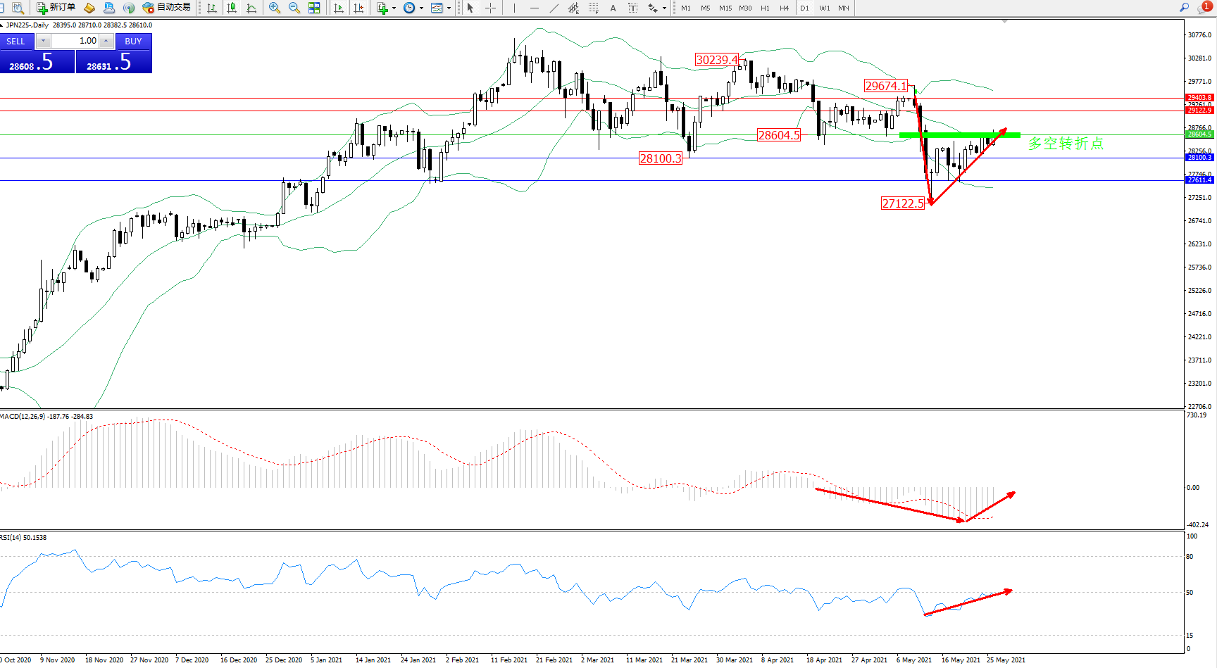 日经225指数5月26日(周三)收盘上涨87.52点,涨幅0.31%,报28641.50点。日本政府在5月经济报告中下调对整体经济的评估,为三个月来首次下调,因该国主要地区进入新冠疫情紧急状态,对消费和企业状况产生影响。当局还重申警告,要对新冠疫情卷土重来给经济前景带来的下行风险给予足够关注。经济报告显示,由于新冠疫情紧急状态的影响,日本政府在5月份下调了对经济的看法。日本政府下调了对消费支出和商业状况的看法。日本东京都知事小池百合子称,东京及周边地区将寻求扩大国企的规模。据共同社消息,东京电力公司考虑把福岛第一核电站储水罐内约137万吨的核污染水中的大约3万吨转移出来,以检测其中的放射性物质含量,为核污染水排放入海做准备。