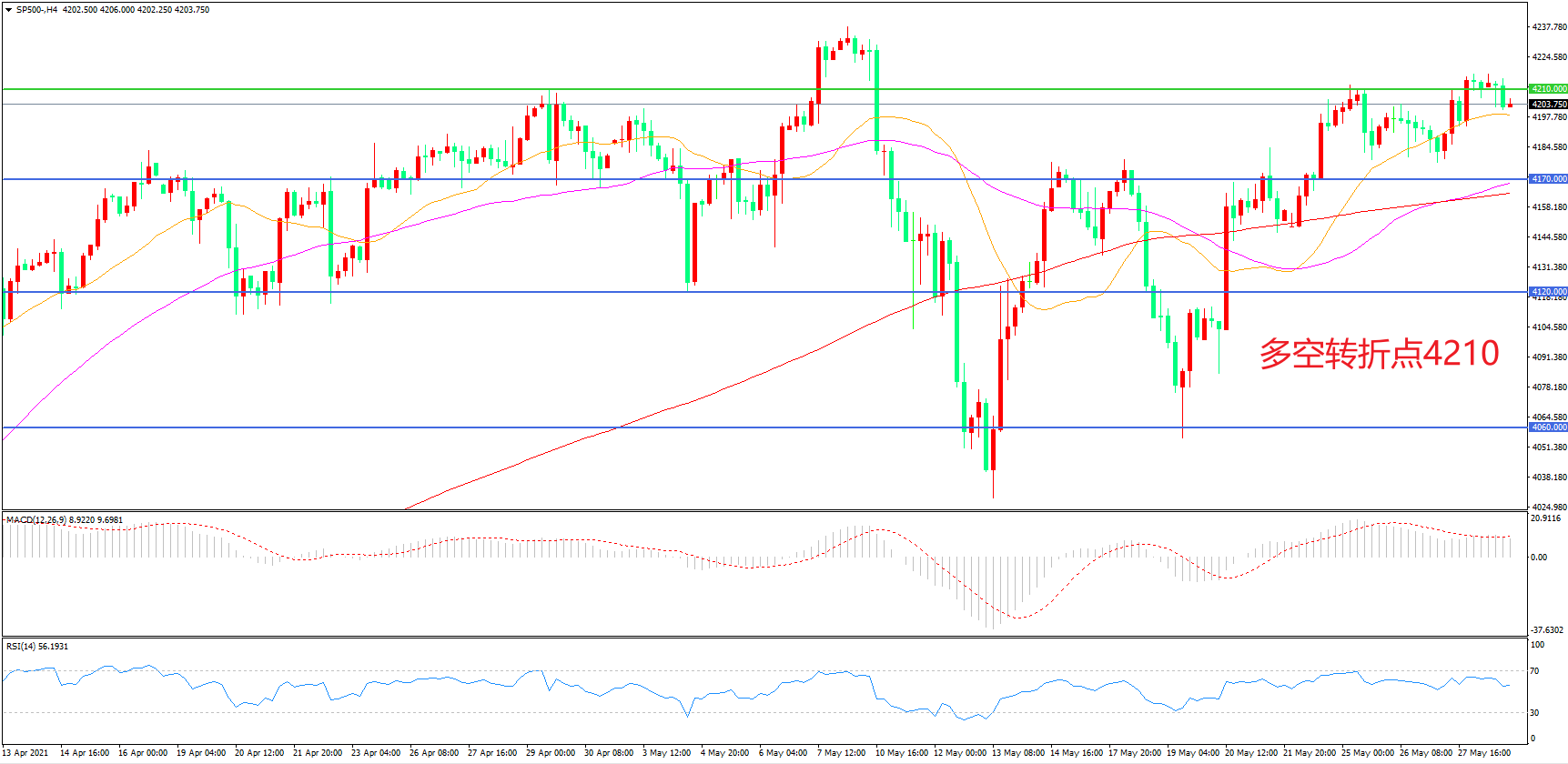 4小时图看,标普500呈现区间震荡形态,4210成为短期多空分水岭,21周期均线成为短期支撑,MACD红柱缩短,RSI指标走平,日内震荡上行概率较大。
