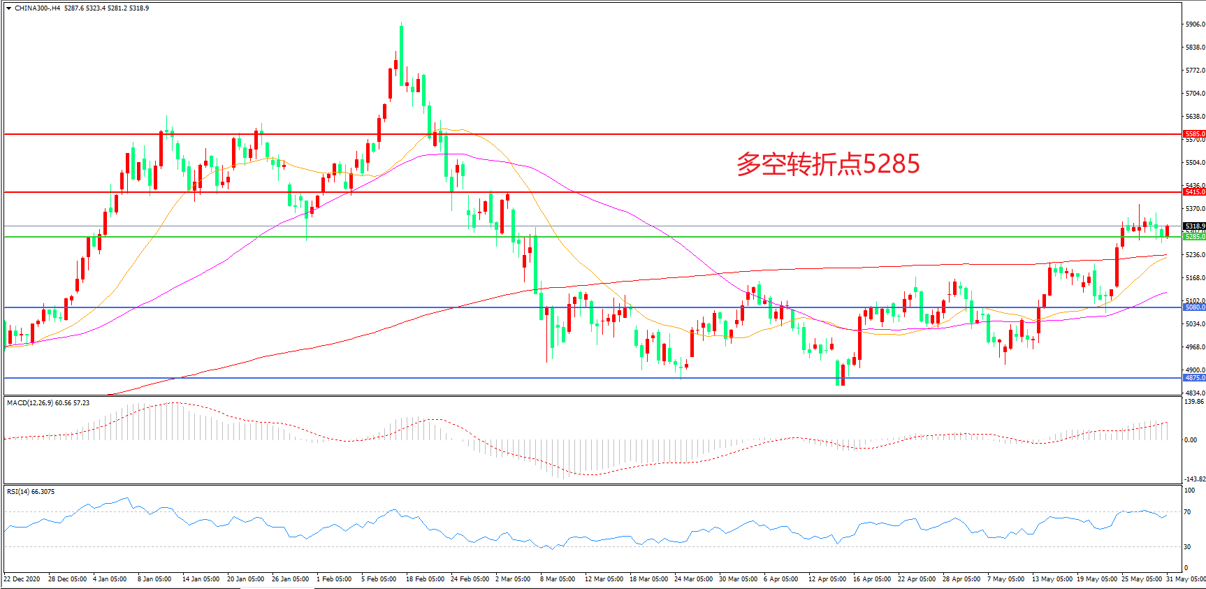 4小时图看,沪深300突破整理区间后陷入震荡,短线涨势暂缓,但上升趋势依然完好,5285成为多空分水岭,均线系统拐头向上,MACD红柱增加,RSI指标走平,日内震荡上行概率较大。