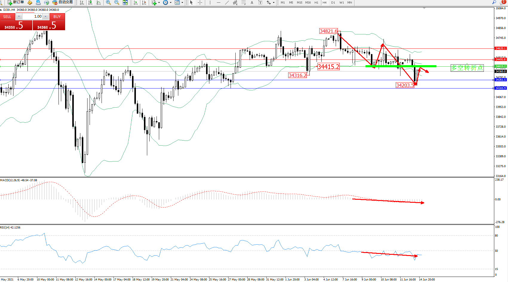 技术点评:空头动力延续布林带指标通道中下轨区间持续震荡向下移动中,低位跌破下轨至34203位置后短暂回升,但下行趋势走势依旧良好,有进一步向下移动态势,布林带指标有缓慢张口迹象,MACD指标处于0轴线下方空头区域维持整理平移中,RSI指标处于50均衡线下方持续震荡中;