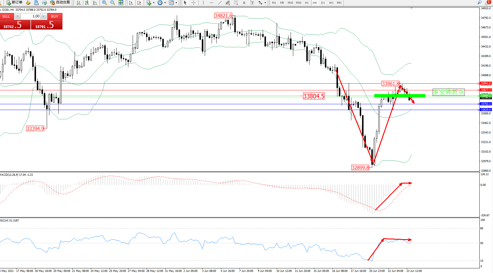 技术点评:空头动力延续布林带指标下轨附近持续下挫至32899位置后得到支撑反转上扬,呈V型走势不断拉升中,高位抵达33961附近节点后开始震荡,布林带指标呈收口走势后不断平移中,MACD指标处于空头区域低位持续震荡回升,纠结于0轴线附近弱势徘徊中,RSI指标处于50均衡线上側弱势整理中;