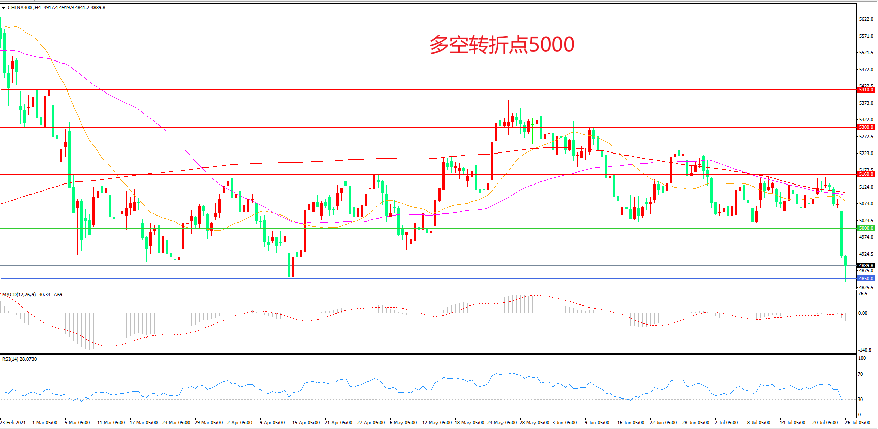 4小时图看,沪深300长阴下破,联系跌破两道关口,整体走势偏空,5000点成为上方阻力,4850点成为下方支撑,均线系统拐头向下,日内延续下行概率较大。