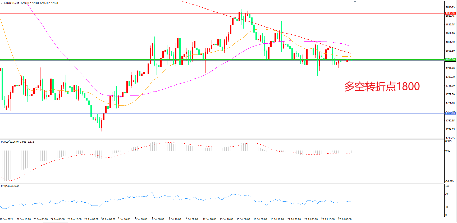周二(7月27日),在美联储政策会议召开之际,市场情绪趋于谨慎,现货黄金延续窄幅震荡,收报1799.39美元/盎司。目前投资者正在等待美联储发布最新的货币政策和鲍威尔的新闻发布会发言,如果美联储考虑到对Delta变种的担忧,美元可能会迅速延续跌势,如果美联储摆脱这些担忧,正式承认美联储将缩减购债规模,美元将大涨,这都会对金价产生重大影响,务必重点关注。