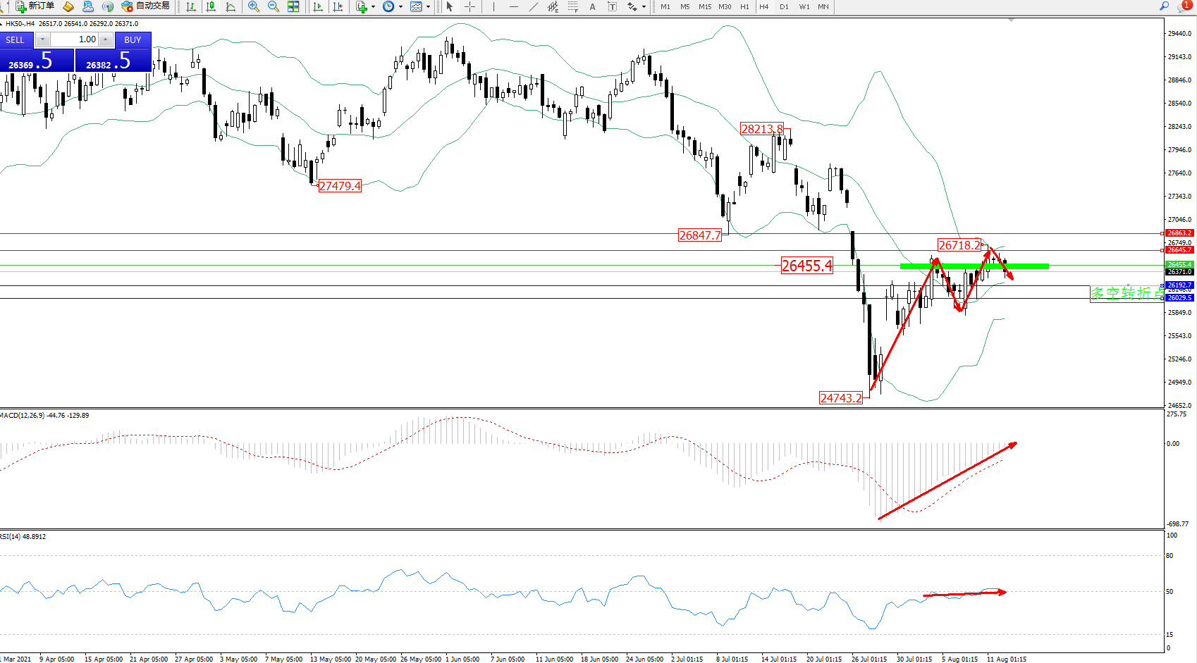 香港恒生指数8月12日(周四)收盘下跌142.34点,跌幅0.53%,报26517.82点;港股主要指数集体收跌,三大指数午后跌幅明显扩大,港股科技股尾盘进一步走弱,恒生科技指数跌1.49%报6719点。近期表现活跃的生物医药股大跌,腾盛博药跌近15%,科济药业-B跌5%,方达控股、沛嘉医疗-B跌超4%,启明医疗-B、药明康德和药明巨诺-B跌超3%。大型科网股普跌,百度、小米均跌2%,京东、阿里巴巴、腾讯皆有跌幅;今日大市成交额为1358亿港元,南下资金逆势净流入14.96亿港元。