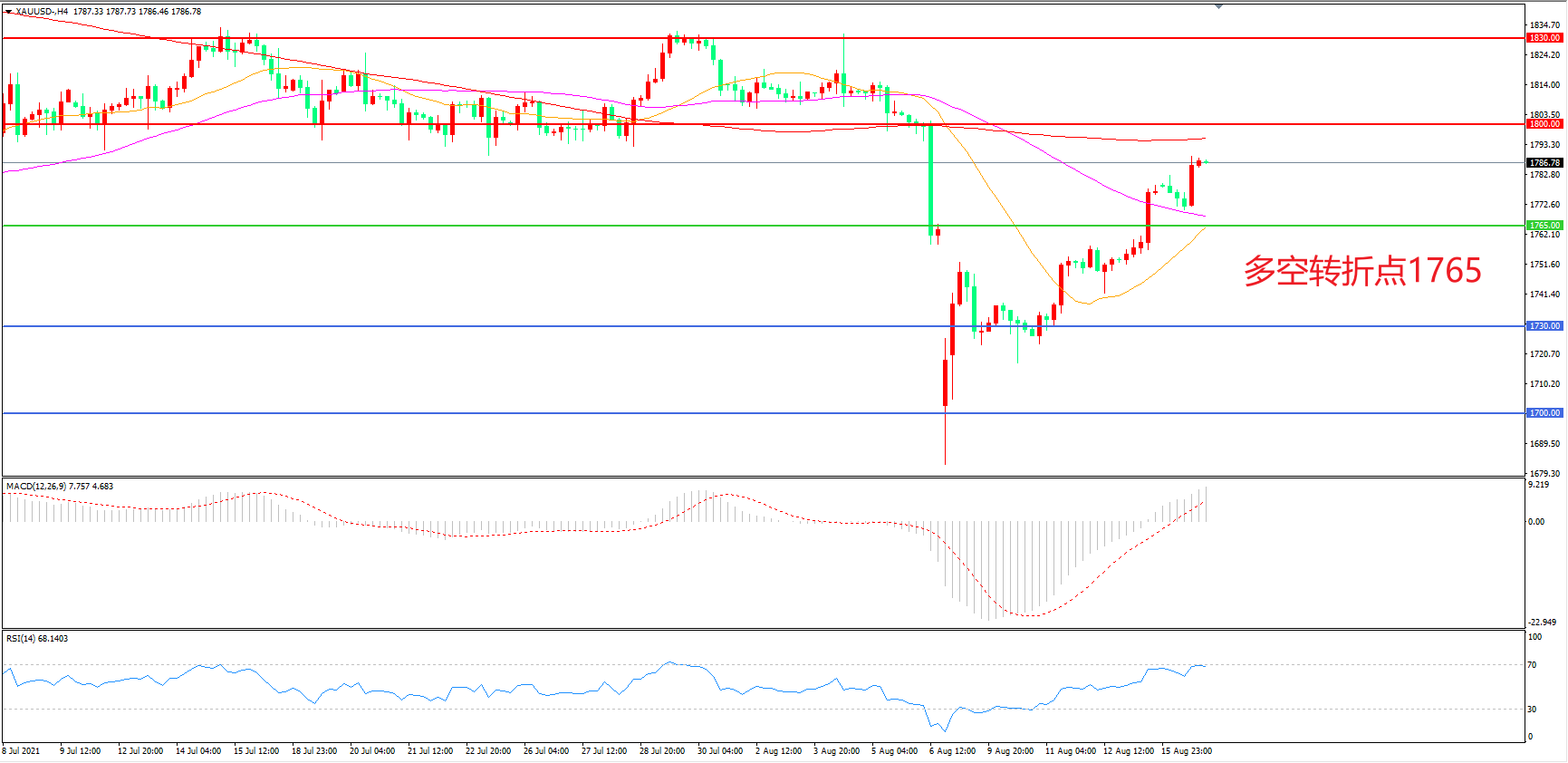 交易策略:  在1765.00之上看涨,目标1800.00           1830.00