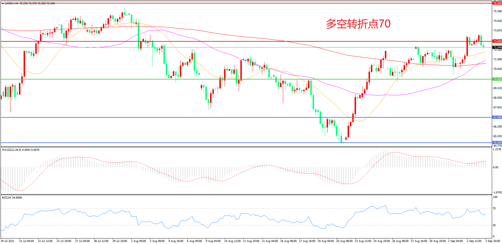 4小时图看,油价长阳拉升后再度回落,但上升趋势依然完好,均线系统成为下方支撑,71美元成为上方阻力,MACD红柱缩短,RSI指标走平,日内震荡上行概率较大。
