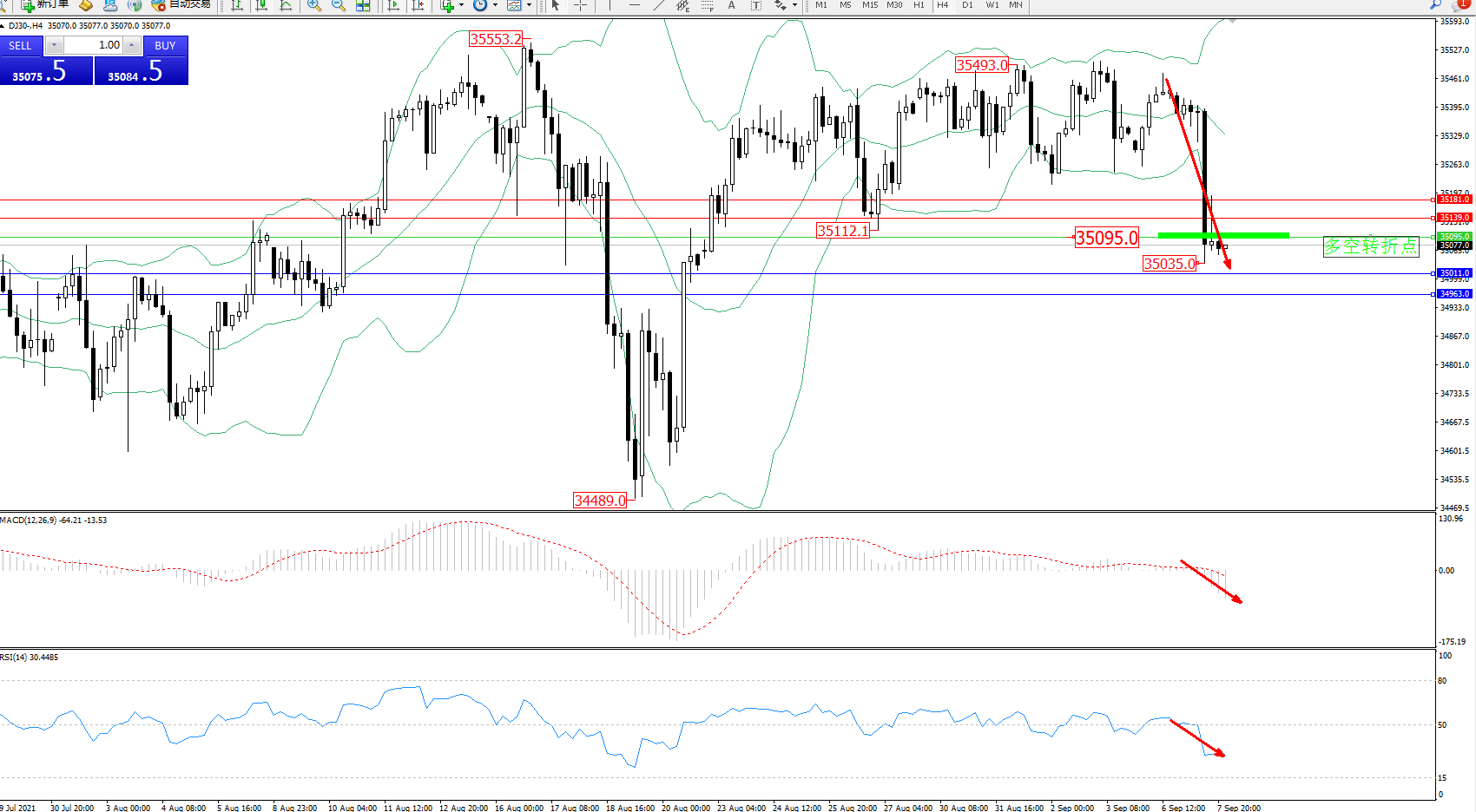 技术点评:高位长时间维持在布林带指标通道内宽幅震荡平移,空头动力终究迎来下挫走势,跌破布林带指标下轨附近节点后不断下行,低位抵达35035位置后开始整理,短期或维持低位震荡走势,布林带指标呈张口走势持续中,MACD指标处于0轴线下方空头区域持续下行,RSI指标纠结于50均衡线下方空头区域持续整理中;