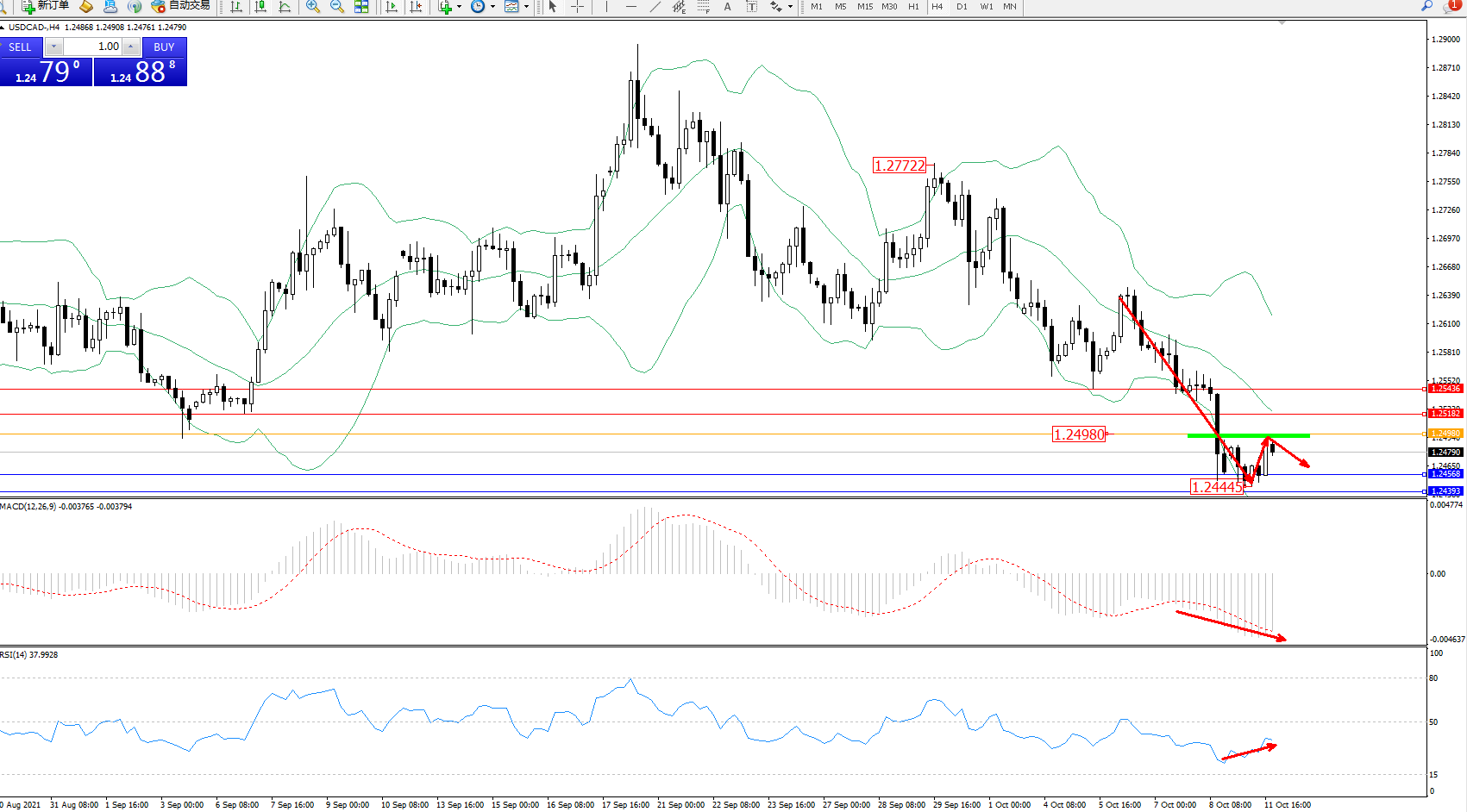 技术点评:空头动力延续布林带指标通道中下轨区间持续震荡下行,低位抵达1.24445位置后得到短暂支撑开始震荡反转,但低位多头动力欠缺,短期未能继续向上移动,布林带指标呈收口走势有继续向下移动态势,MACD指标处于空头区域维持震荡下行后开始走平,RSI指标处于空头区域低位有开始缓慢上移迹象;