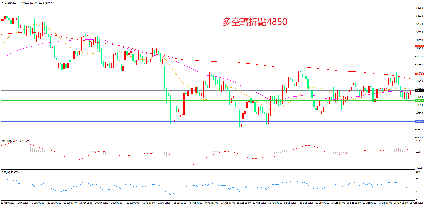 4小時圖看,滬深300延續區間震盪形態 ,4850成為下方支撐,200週期均線成為上方阻力,均線系統走平,MACD紅柱減少,RSI指標向上,日內延小幅上行概率較大。