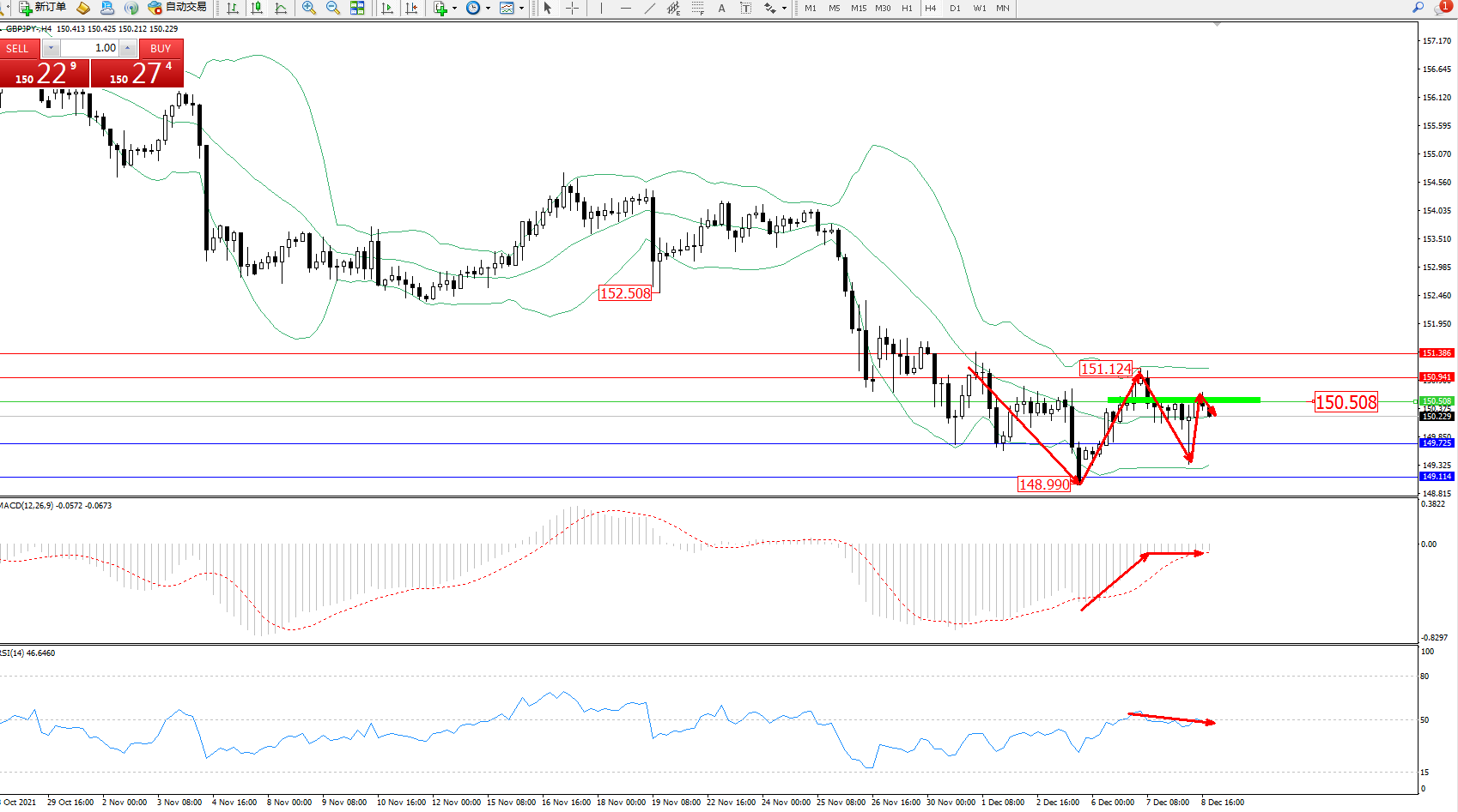 技术点评:空头动力延续布林带指标通道中下轨区间持续震荡下行,低位抵达148.990位置节点后反转震荡上扬,短期纠结于通道内持续宽幅整理平移中,但整体市场喘息向下移动中,布林带指标呈收口走势平移,MACD指标空头区域持续震荡上移后维持0轴线下方弱势徘徊中,RSI指标纠结于50均衡线附近弱势整理;