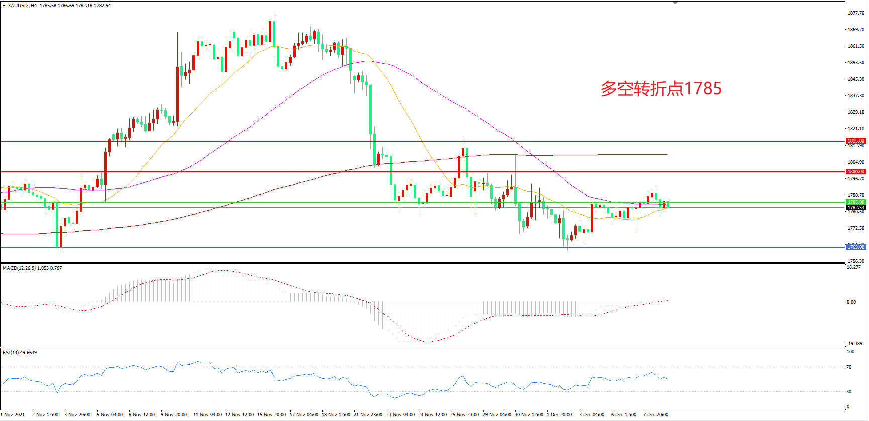 周三(12月8日),因美债收益率和美元走软。投资者关注焦点转向本即将出炉的通胀数据,金价延续清淡表现,收报1782.54美元/盎司。目前前美国CPI已经连续六个月达到或高于5%,是美联储2%目标的两倍多,如果11月通胀数据再度飙升,可能会加强美联储加息预期,对金价形成更大压力。