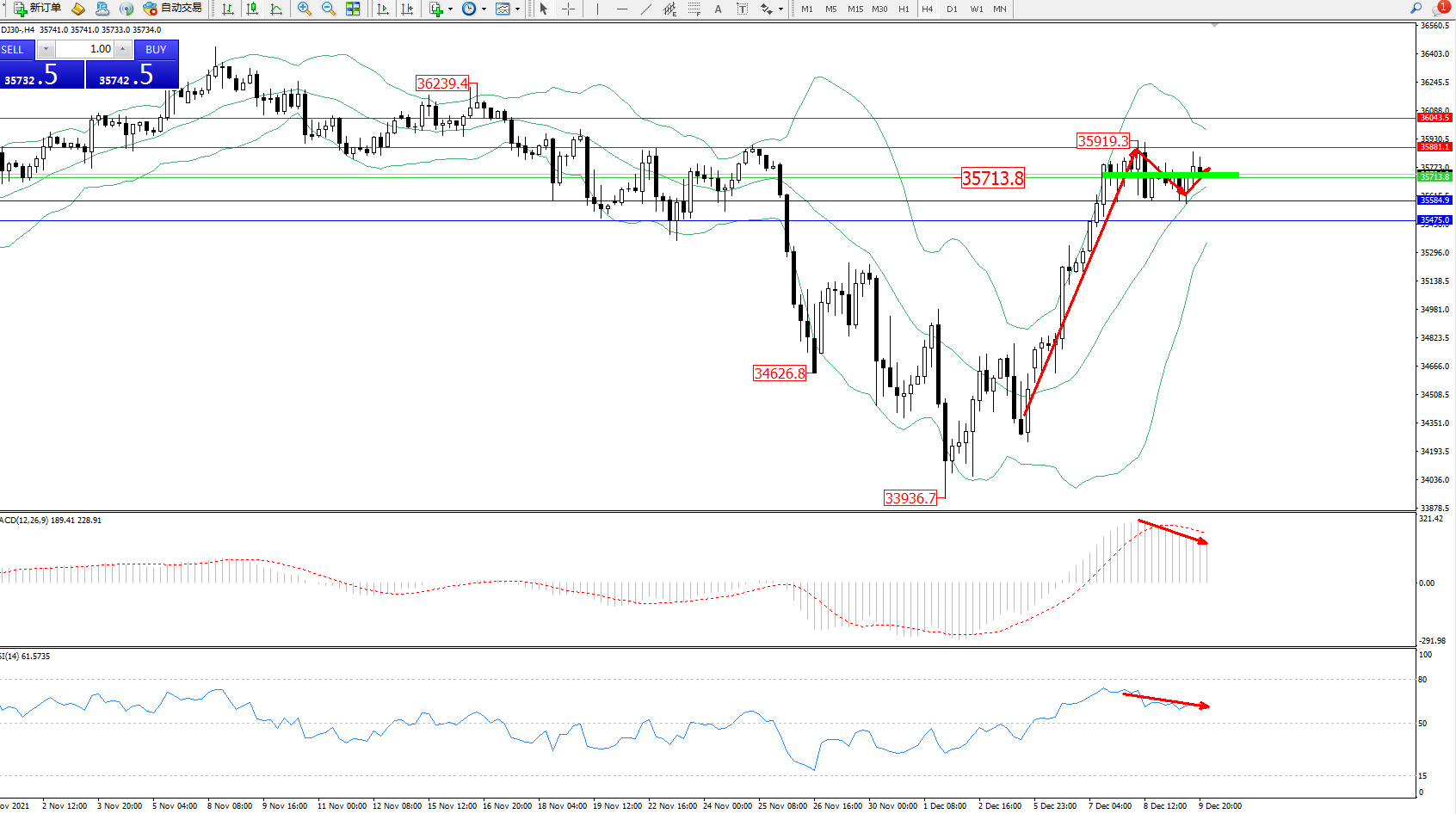 技术点评:多头动力延续布林带指标上轨附近持续震荡上扬,高位抵达35919位置后开始高位整理平移,布林带指标呈收口走势持续中,MACD指标处于多头区域维持整理缓慢下行,RSI指标处于多头区域维持整理平移;