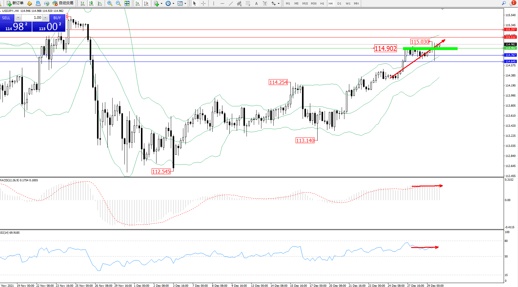 美元兑日圆维持114.982附近震荡,由于市场避险需求有所回升,美元兑日元和瑞士法郎走低,美元指数在隔夜市场下跌,市场因在假日季交易清淡,任何市场波动可能都被夸大了。大多数人只想为本年度收官,完成交易计划后退出,预计市场在短期不会有大的波动。
