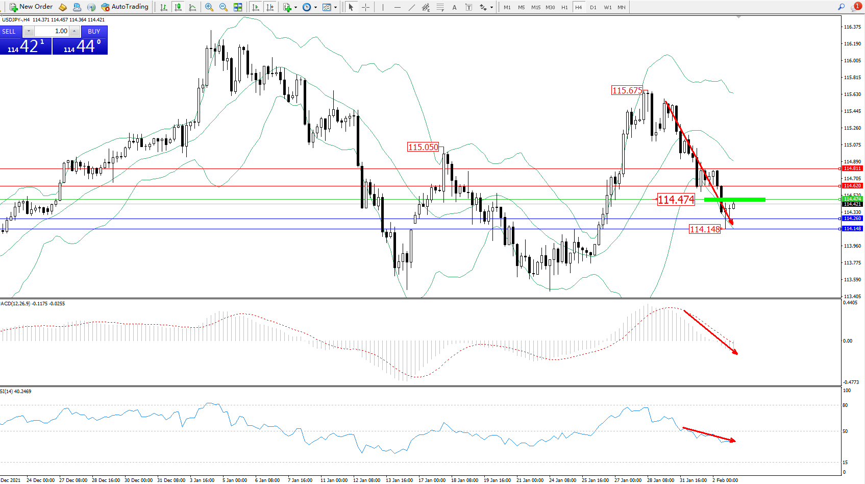 技术点评:空头动力延续布林带指标下轨附近持续震荡下行,低位抵达114.148位置节点后得到支撑震荡,短期空头动力依旧有进一步向下移动态势,布林带指标呈收口向下移动态势良好,MACD指标处于0轴线下方弱势下行,RSI指标处于50均衡线下侧窄幅整理中;