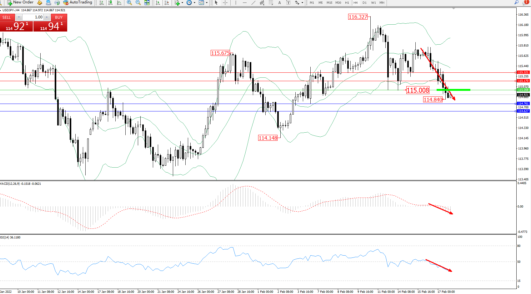 技术点评:空头动力延续布林带指标下轨附近不断震荡下行,低位抵达114.840附近节点后有继续下行态势,且空头下行动力未见有止步迹象,布林带指标呈张口走势态势良好,MACD指标处于0轴线下方不断下行中,RSI指标处于50均衡线下侧不断向下移动;