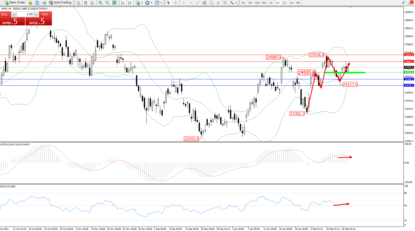 技术点评:多头动力呈阶梯式震荡上扬,触及布林带指标上轨25058位置附近遇阻回撤,短期纠结于中上轨区间震荡平移,多头动力有继续向上移动迹象,布林带指标呈收口走势中,MACD指标处于0轴线上方弱势整理平移,RSI指标处于50均衡线上側窄幅徘徊中;