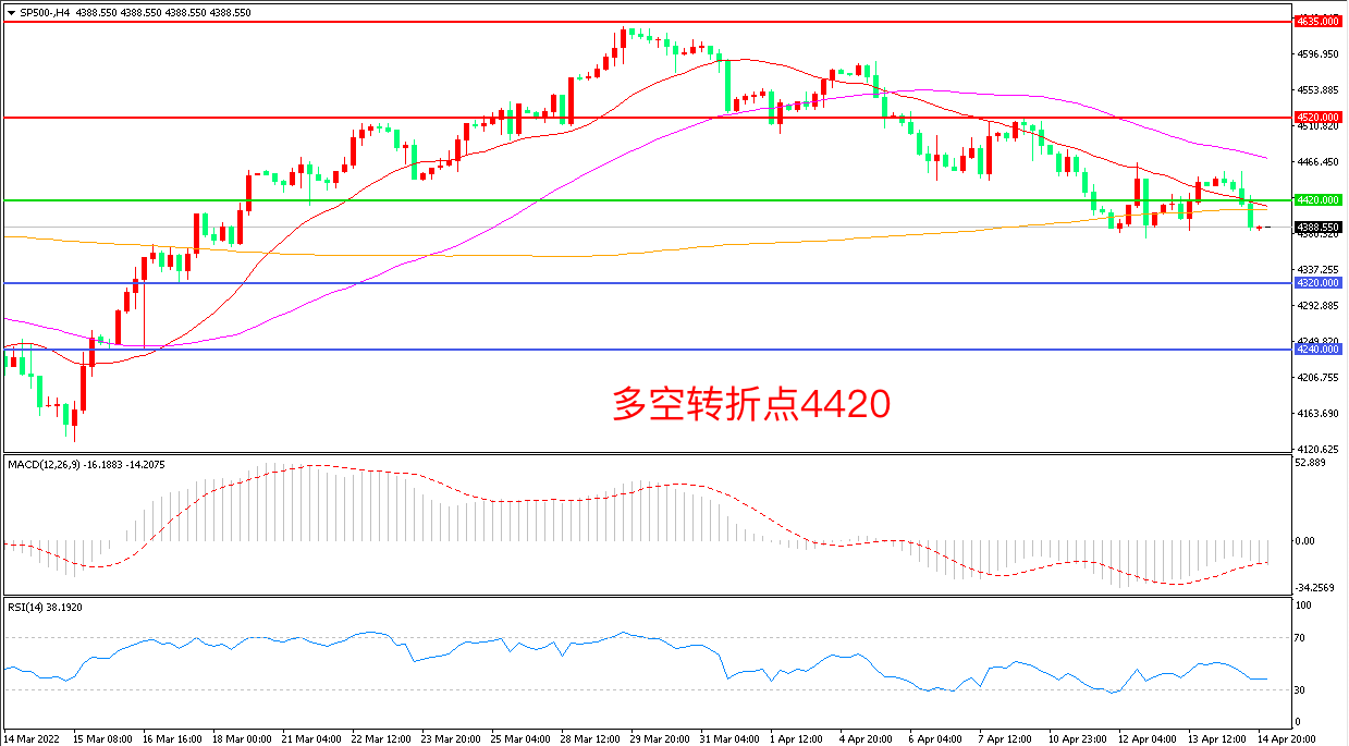 4小时图看,标普500冲高回落,横盘迹象明显,4420成为多空分水岭,MACD绿柱缩短,RSI指标走平,日内延续震荡概率较大。