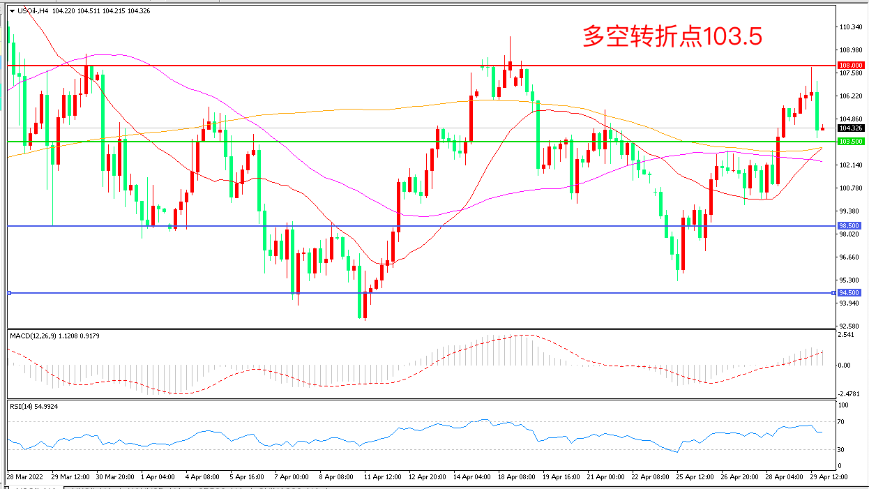 4小时图看,油价触碰108阻力后再度回落,上行趋势暂缓,但整体仍处于多头形态内,MACD红柱增加,RSI指标走平,日内震荡上行概率较大。