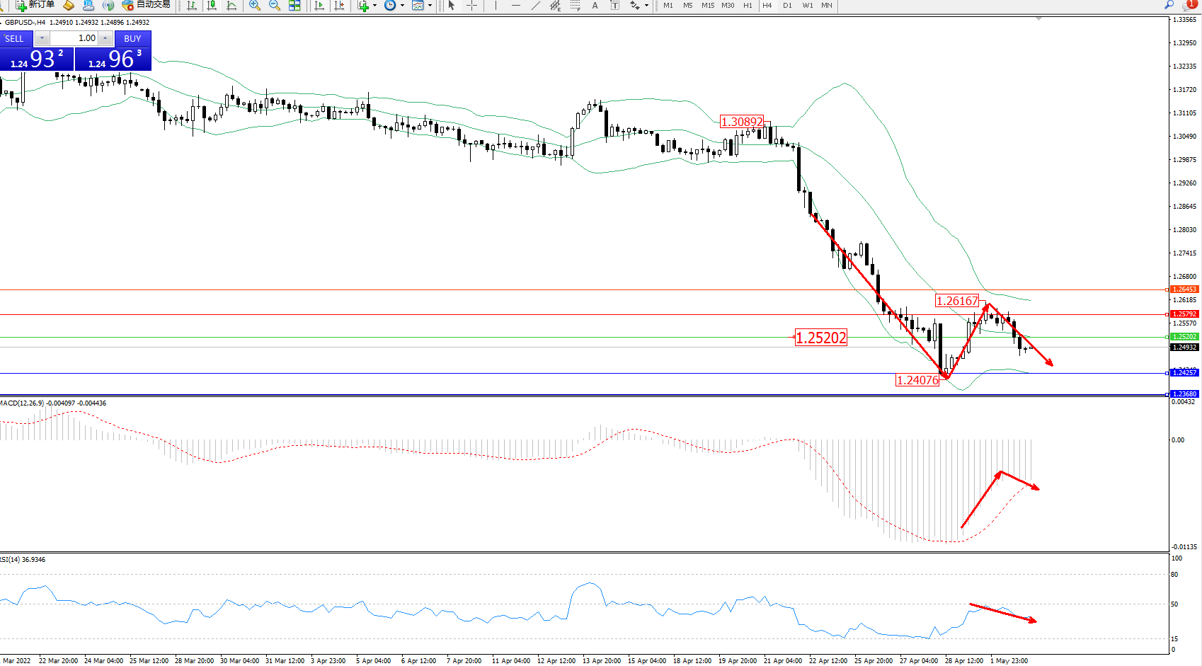 技术点评:空头动力延续布林带指标通道中下轨区间持续震荡下行,低位抵达1.24076附近后开始反转上移,短期处于低位窄幅整理平移,波幅空间逐渐收窄,布林带指标呈收口走势中,MACD指标处于空头区域低位拉升后开始平移,RSI指标处于50均衡线下侧窄幅整理缓慢下行;