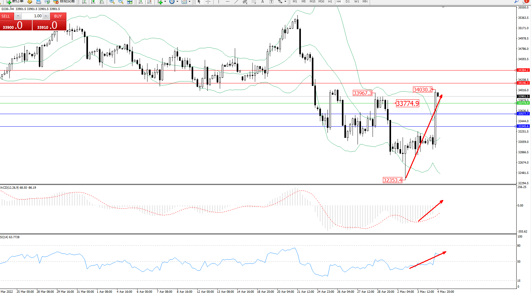 技术点评:低位多头动力急速拉升上扬,突破布林带指标上轨至34030附近节点后整理,短期多头动力有继续拉升态势,布林带指标呈张口走势中,MACD指标低位多头动力维持震荡上移至0轴线上方徘徊,RSI指标处于50均衡线上方不断上移中;