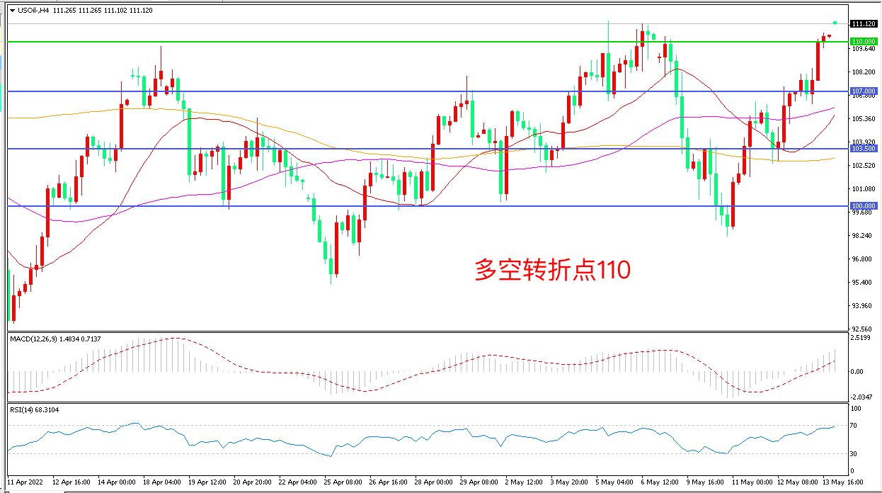 上周五(5月13日),根据三大机构月报显示,虽然有需求下行,经济数据不佳,但供需数据显示原油市场供应仍然紧张,美国WTI原油大幅走高,收报110.43美元/桶。虽然需求预期持续下调,但供应端的风险仍是市场更加担心的因素,短期油价依然以上行为主。