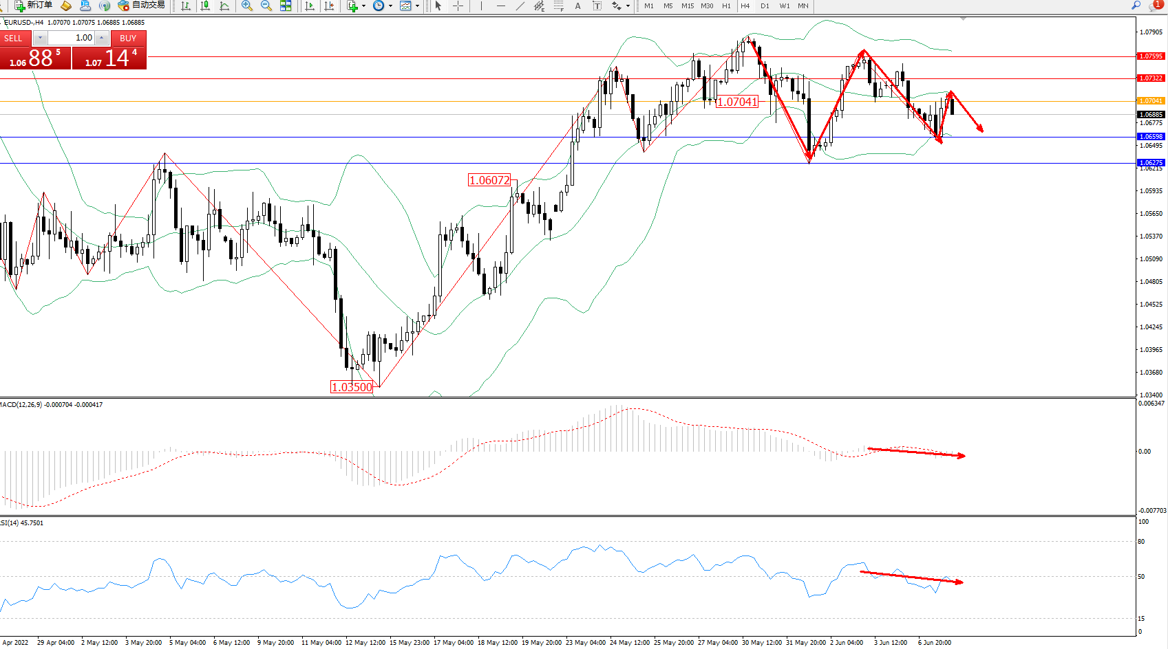 欧元美元EURUSD—4小时K线图显示: