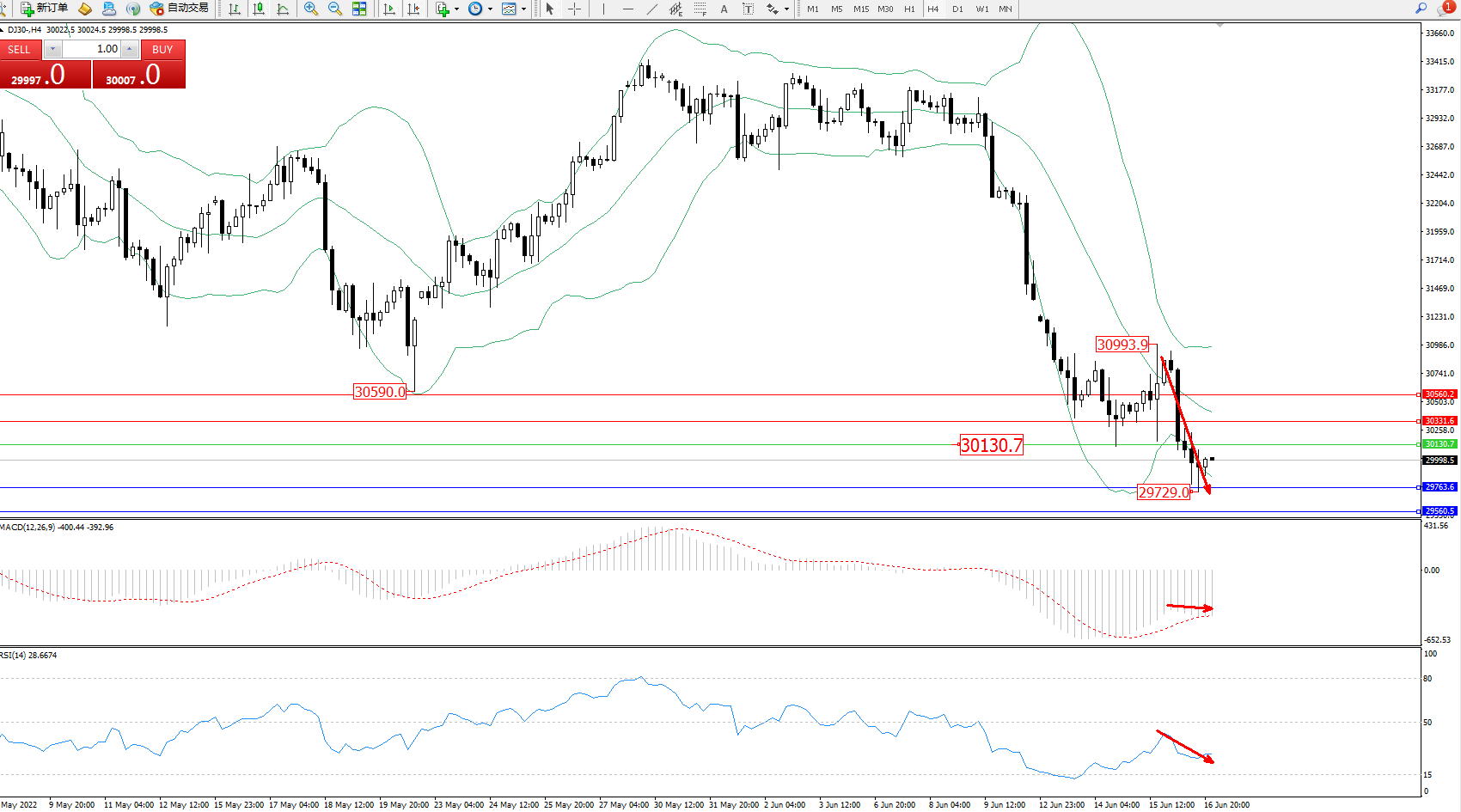 道琼斯指数6月16日(周四)收盘下跌739.22点,跌幅2.41%,报29929.31点;美联储主席鲍威尔给投资者描绘了乐观的场景,但市场发现央行实际上很难同时避免高通胀和经济衰退。