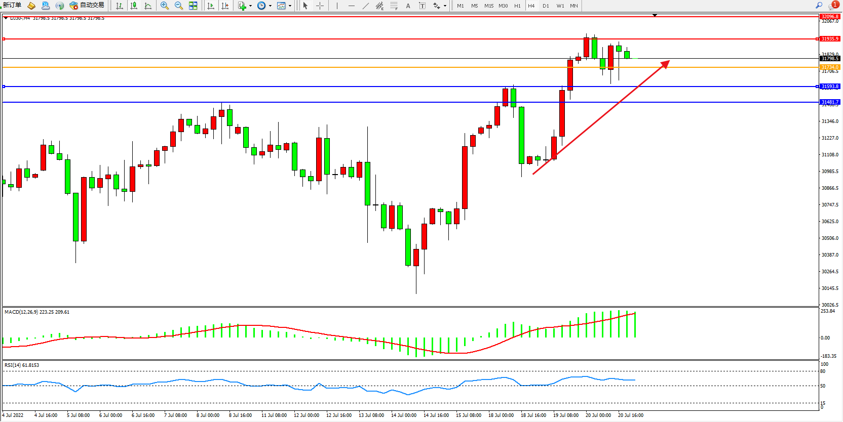 4小时图看:多头动力维持震荡拉升上扬,高位短期整理,MACD指标处于多头区域维持震荡平移中,RSI指标处于多头区域维持弱势徘徊;