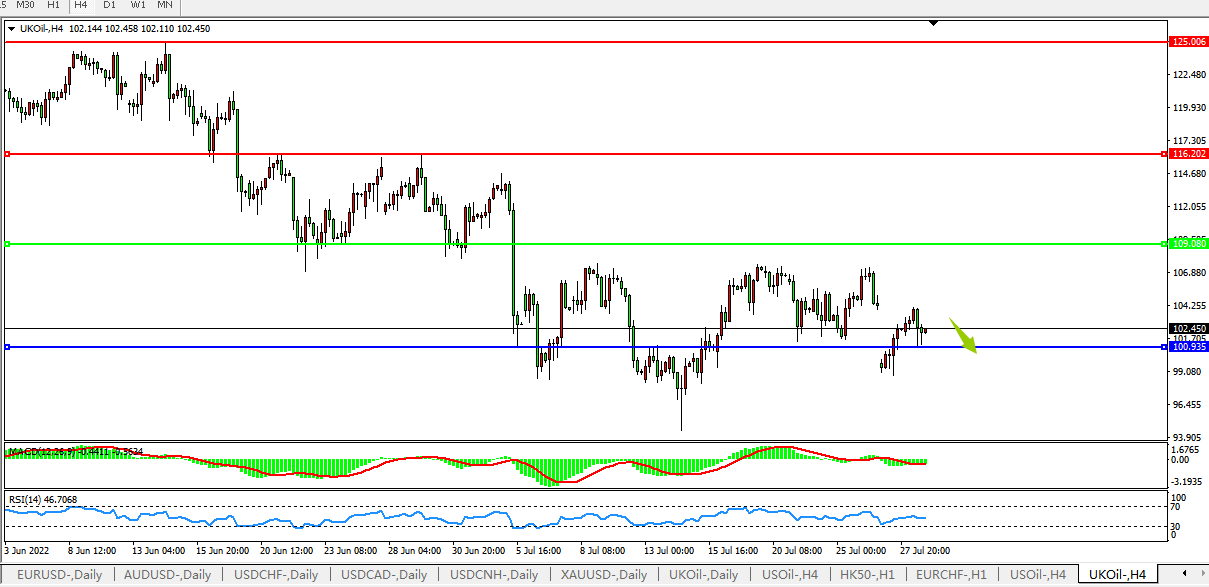 4小时图看:短线价格小幅反弹后再度下挫,中期图形结构依旧偏弱,且趋势线破败, MACD量能柱0轴下小幅缩量,RSI小幅走弱,短期油价反弹后下行概率较大。