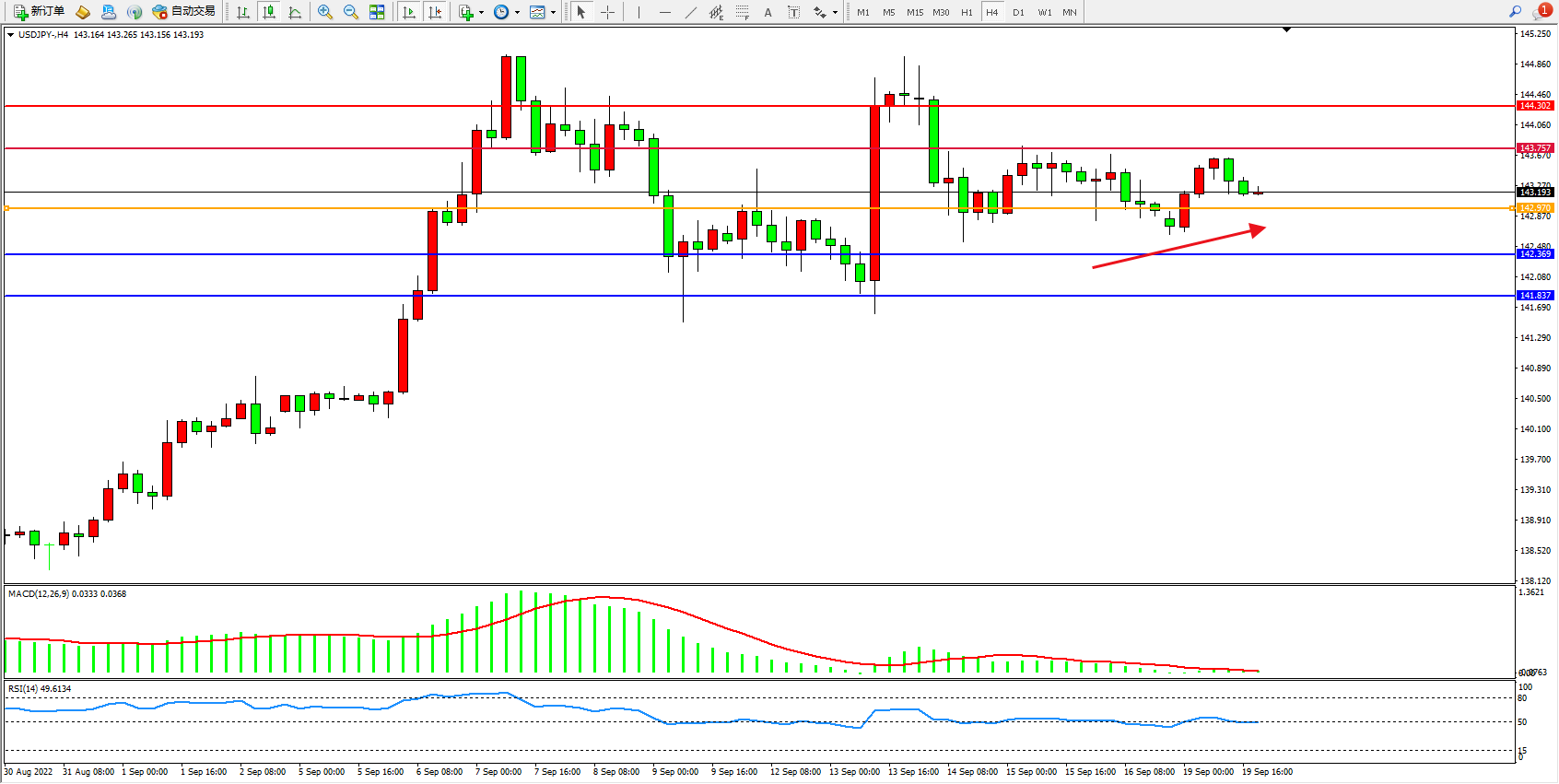交易策略:142.970上方看涨,目标143.757、144.302