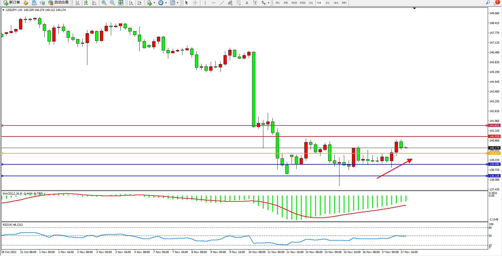4小时图看:低位窄幅区间震荡后有缓慢上移迹象,短期多头动力开始有伺机入场迹象,MACD指标处于空头区域整理上移,RSI指标处于50均衡线附近弱势整理中;