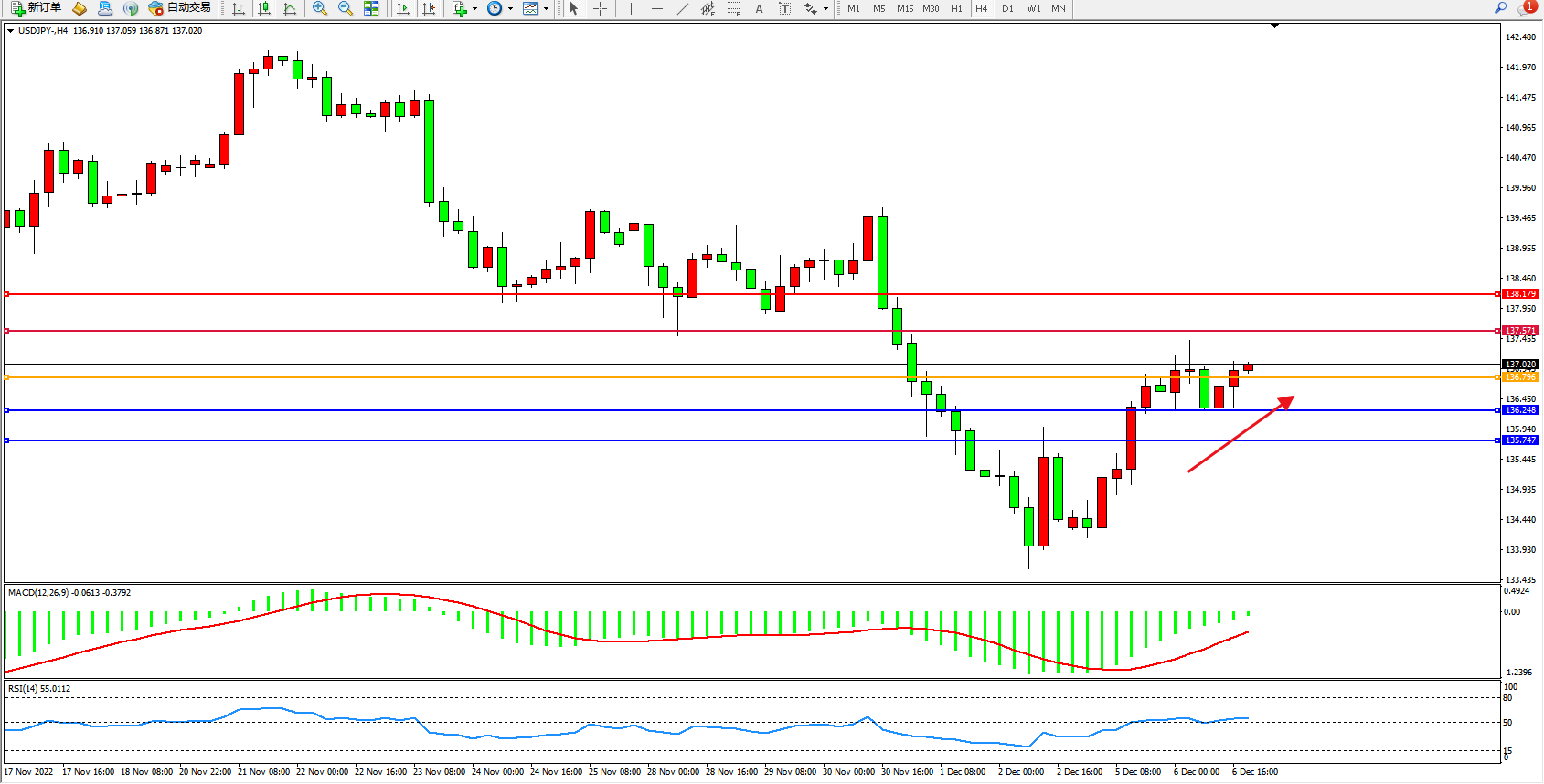 4小时图看:低位多头动力维持震荡上移,短期窄幅整理后有继续向上拉升迹象,MACD指标处于空头区域维持震荡上移至0轴线附近徘徊,RSI指标处于50均衡线上側弱势整理;