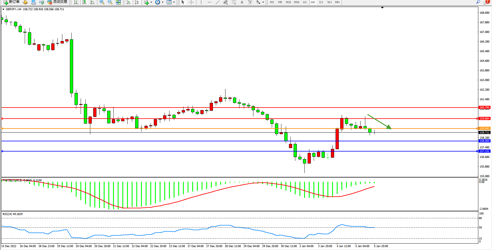 交易策略:159.040下方看跌,目标158.000、157.151