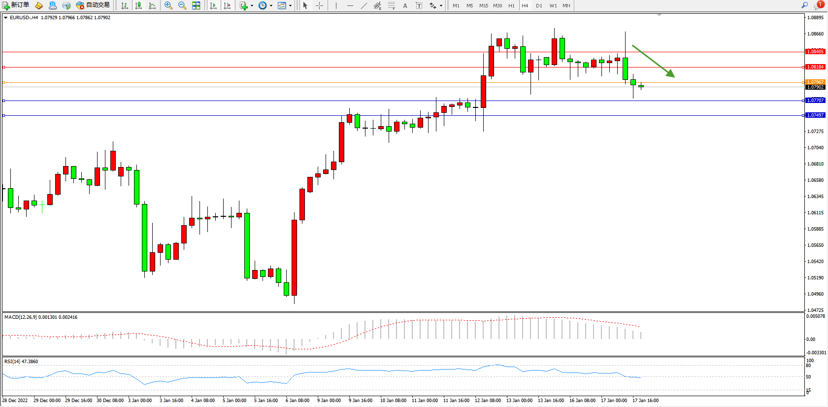 欧元美元EURUSD—4小时K线图显示: