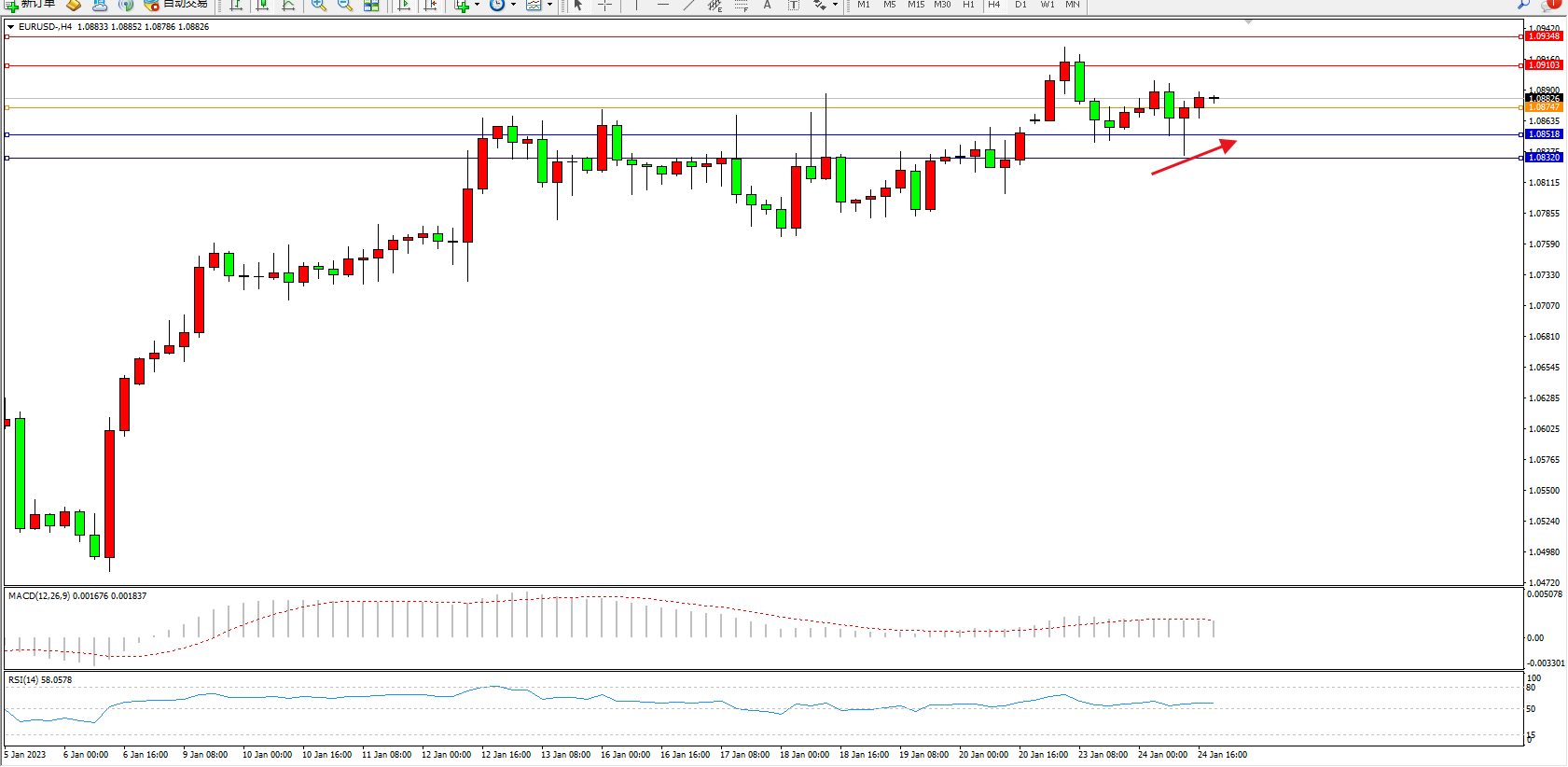 欧元美元EURUSD—4小时K线图显示: