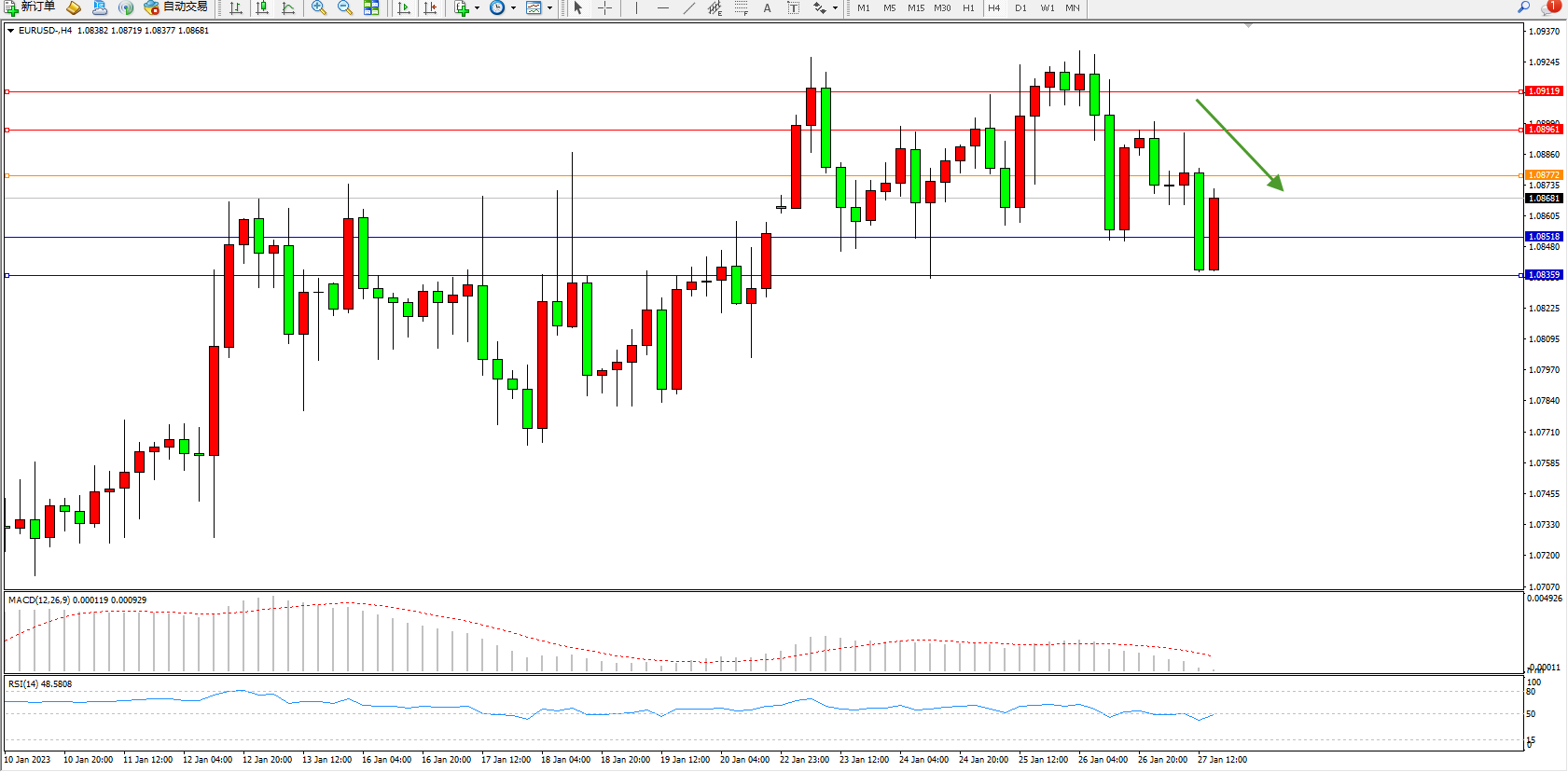 交易策略:1.08772下方看跌,目标1.08518、1.08359